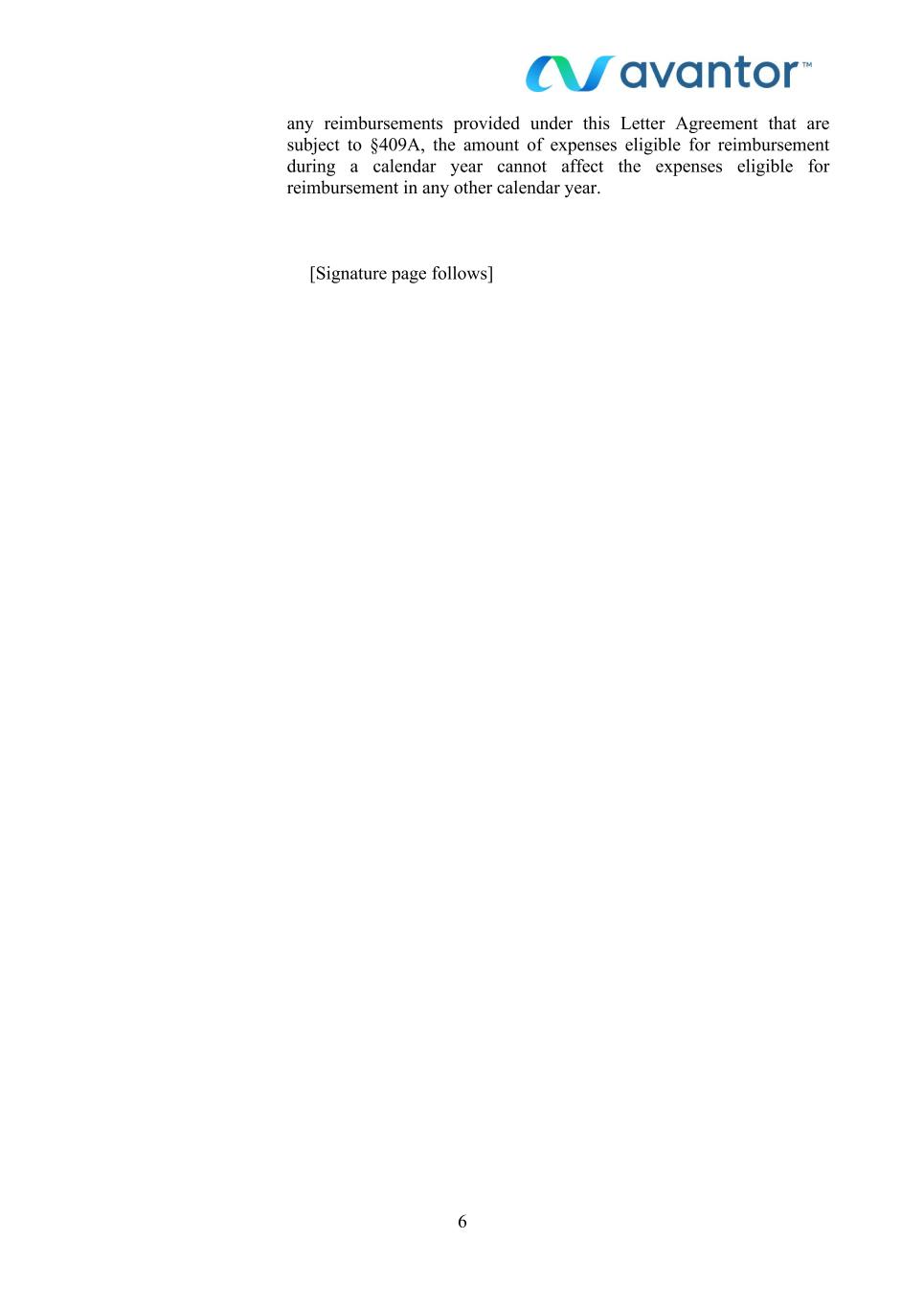 5 employment subsequent to your employment with Avantor. Subject to the notice requirement(s) as set forth above, either you or Avantor may terminate your employment with Avantor at any time. Except as provided above in this Severance/Restrictive Covenants section, you shall not be entitled to any other salary, compensation of ant form, or benefits from Avantor after termination of your employment with Avantor, except as otherwise specifically provided for in Avantor’s employee benefit plans or as otherwise expressly required by applicable law. Notwithstanding anything herein to the contrary, if any payments due hereunder would subject you to any tax imposed under Section 409A of the Internal Revenue Code of 1986, as amended (the “Code”), as a result of your characterization as a “specified employee” of Avantor (within the meaning of Treasury Regulation Section 1.409A-1(i)), then such payments that would otherwise cause such taxation shall be payable in a single lump sum on the first business day that is one hundred eighty (180) days following your “separation from service” (within the meaning of Code Section 409A and the regulations thereunder), and any remaining payments will be made in accordance with the foregoing provisions of this section. Personal Services Agreement: As a condition to entering into this Letter Agreement with the Company, you shall execute and agree to be bound by the Personal Services, Confidentiality, and Inventions Agreement, in the form attached hereto as Exhibit A. Entire Agreement: This Letter Agreement, (including any Annexes attached hereto) and the Personal Services, Confidentiality and Inventions Agreement referenced above set forth the entire understanding between you and Avantor with respect to the subject matter hereof and thereof, and supersede and preempt all prior oral or written understandings and agreements with respect to the subject matter hereof and thereof between you and Avantor, which shall terminate and be of no further effect upon the execution of this Letter Agreement. This Letter Agreement, and all of your rights and duties hereunder, shall not be assignable or delegable by you. Any purported assignment or delegation by you in violation of the foregoing shall be null and void ab initio and of no force and effect. This Letter Agreement may be assigned by Avantor to a person or entity which is a successor in interest to substantially all of the business operations of Avantor, or to a subsidiary or affiliate of Avantor. Upon such assignment, the rights and obligations of Avantor hereunder shall become the rights and obligations of such subsidiary, affiliate or successor person or entity. Code Section 409A: This Letter Agreement will be interpreted to avoid any tax under §409A of the Code. For purposes of §409A, each payment made under this Letter Agreement will be treated as a separate payment. With respect to
