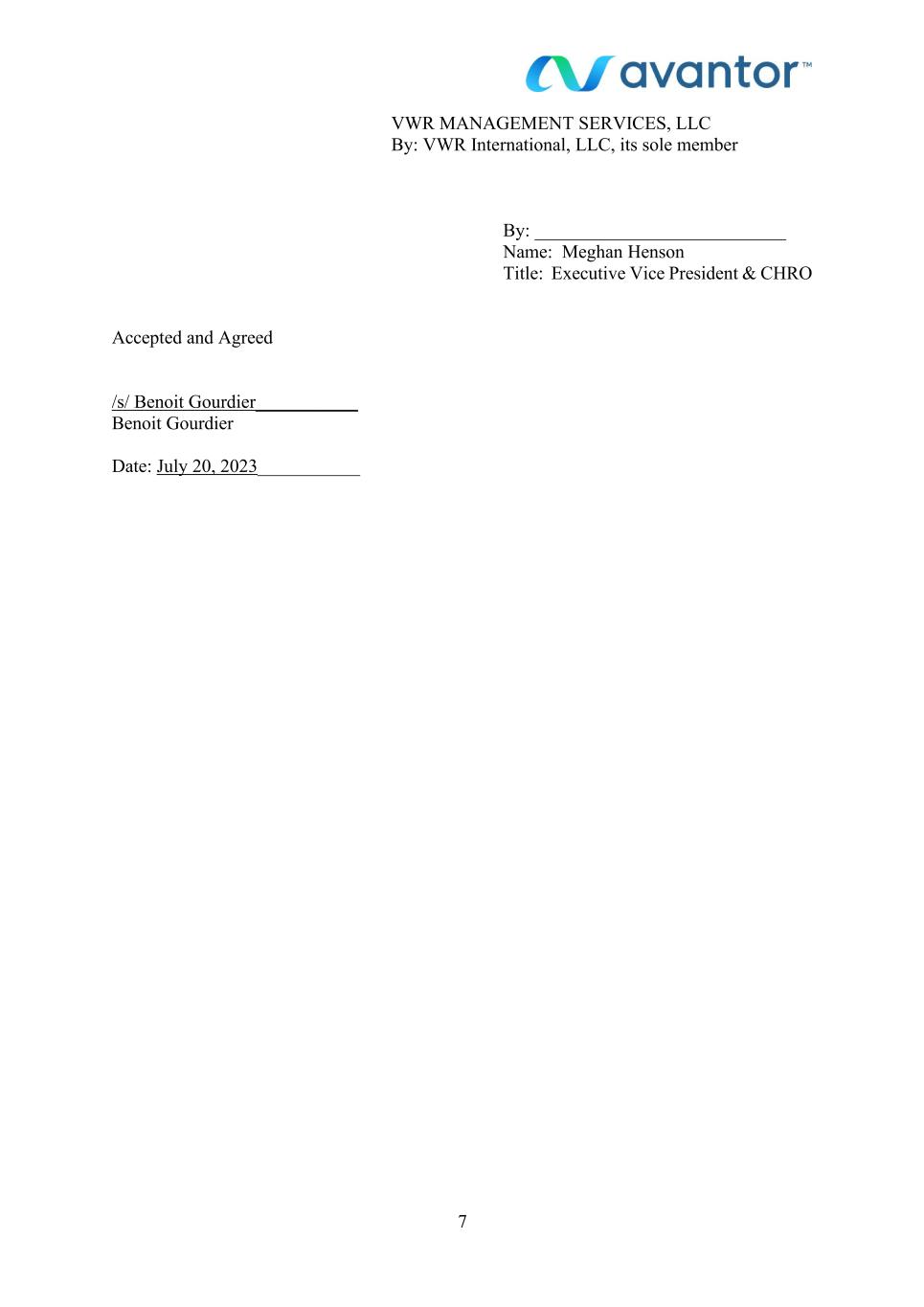 7 VWR MANAGEMENT SERVICES, LLC By: VWR International, LLC, its sole member By: ___________________________ Name: Meghan Henson Title: Executive Vice President & CHRO Accepted and Agreed /s/ Benoit Gourdier___________ Benoit Gourdier Date: July 20, 2023___________