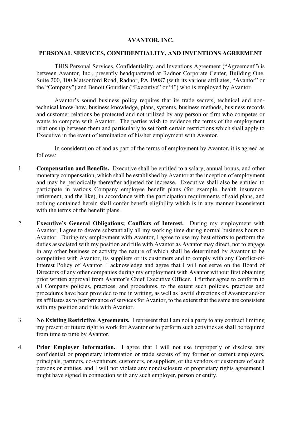 AVANTOR, INC. PERSONAL SERVICES, CONFIDENTIALITY, AND INVENTIONS AGREEMENT THIS Personal Services, Confidentiality, and Inventions Agreement (“Agreement”) is between Avantor, Inc., presently headquartered at Radnor Corporate Center, Building One, Suite 200, 100 Matsonford Road, Radnor, PA 19087 (with its various affiliates, “Avantor” or the “Company”) and Benoit Gourdier (“Executive” or “I”) who is employed by Avantor. Avantor’s sound business policy requires that its trade secrets, technical and non- technical know-how, business knowledge, plans, systems, business methods, business records and customer relations be protected and not utilized by any person or firm who competes or wants to compete with Avantor. The parties wish to evidence the terms of the employment relationship between them and particularly to set forth certain restrictions which shall apply to Executive in the event of termination of his/her employment with Avantor. In consideration of and as part of the terms of employment by Avantor, it is agreed as follows: 1. Compensation and Benefits. Executive shall be entitled to a salary, annual bonus, and other monetary compensation, which shall be established by Avantor at the inception of employment and may be periodically thereafter adjusted for increase. Executive shall also be entitled to participate in various Company employee benefit plans (for example, health insurance, retirement, and the like), in accordance with the participation requirements of said plans, and nothing contained herein shall confer benefit eligibility which is in any manner inconsistent with the terms of the benefit plans. 2. Executive’s General Obligations; Conflicts of Interest. During my employment with Avantor, I agree to devote substantially all my working time during normal business hours to Avantor. During my employment with Avantor, I agree to use my best efforts to perform the duties associated with my position and title with Avantor as Avantor may direct, not to engage in any other business or activity the nature of which shall be determined by Avantor to be competitive with Avantor, its suppliers or its customers and to comply with any Conflict-of- Interest Policy of Avantor. I acknowledge and agree that I will not serve on the Board of Directors of any other companies during my employment with Avantor without first obtaining prior written approval from Avantor’s Chief Executive Officer. I further agree to conform to all Company policies, practices, and procedures, to the extent such policies, practices and procedures have been provided to me in writing, as well as lawful directions of Avantor and/or its affiliates as to performance of services for Avantor, to the extent that the same are consistent with my position and title with Avantor. 3. No Existing Restrictive Agreements. I represent that I am not a party to any contract limiting my present or future right to work for Avantor or to perform such activities as shall be required from time to time by Avantor. 4. Prior Employer Information. I agree that I will not use improperly or disclose any confidential or proprietary information or trade secrets of my former or current employers, principals, partners, co-venturers, customers, or suppliers, or the vendors or customers of such persons or entities, and I will not violate any nondisclosure or proprietary rights agreement I might have signed in connection with any such employer, person or entity.