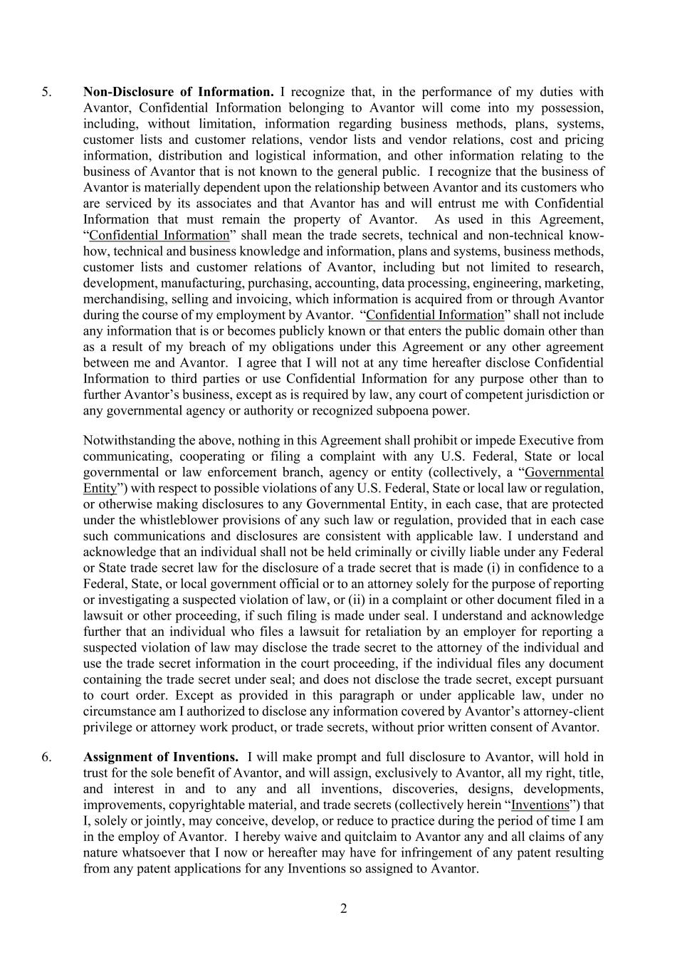 2 5. Non-Disclosure of Information. I recognize that, in the performance of my duties with Avantor, Confidential Information belonging to Avantor will come into my possession, including, without limitation, information regarding business methods, plans, systems, customer lists and customer relations, vendor lists and vendor relations, cost and pricing information, distribution and logistical information, and other information relating to the business of Avantor that is not known to the general public. I recognize that the business of Avantor is materially dependent upon the relationship between Avantor and its customers who are serviced by its associates and that Avantor has and will entrust me with Confidential Information that must remain the property of Avantor. As used in this Agreement, “Confidential Information” shall mean the trade secrets, technical and non-technical know- how, technical and business knowledge and information, plans and systems, business methods, customer lists and customer relations of Avantor, including but not limited to research, development, manufacturing, purchasing, accounting, data processing, engineering, marketing, merchandising, selling and invoicing, which information is acquired from or through Avantor during the course of my employment by Avantor. “Confidential Information” shall not include any information that is or becomes publicly known or that enters the public domain other than as a result of my breach of my obligations under this Agreement or any other agreement between me and Avantor. I agree that I will not at any time hereafter disclose Confidential Information to third parties or use Confidential Information for any purpose other than to further Avantor’s business, except as is required by law, any court of competent jurisdiction or any governmental agency or authority or recognized subpoena power. Notwithstanding the above, nothing in this Agreement shall prohibit or impede Executive from communicating, cooperating or filing a complaint with any U.S. Federal, State or local governmental or law enforcement branch, agency or entity (collectively, a “Governmental Entity”) with respect to possible violations of any U.S. Federal, State or local law or regulation, or otherwise making disclosures to any Governmental Entity, in each case, that are protected under the whistleblower provisions of any such law or regulation, provided that in each case such communications and disclosures are consistent with applicable law. I understand and acknowledge that an individual shall not be held criminally or civilly liable under any Federal or State trade secret law for the disclosure of a trade secret that is made (i) in confidence to a Federal, State, or local government official or to an attorney solely for the purpose of reporting or investigating a suspected violation of law, or (ii) in a complaint or other document filed in a lawsuit or other proceeding, if such filing is made under seal. I understand and acknowledge further that an individual who files a lawsuit for retaliation by an employer for reporting a suspected violation of law may disclose the trade secret to the attorney of the individual and use the trade secret information in the court proceeding, if the individual files any document containing the trade secret under seal; and does not disclose the trade secret, except pursuant to court order. Except as provided in this paragraph or under applicable law, under no circumstance am I authorized to disclose any information covered by Avantor’s attorney-client privilege or attorney work product, or trade secrets, without prior written consent of Avantor. 6. Assignment of Inventions. I will make prompt and full disclosure to Avantor, will hold in trust for the sole benefit of Avantor, and will assign, exclusively to Avantor, all my right, title, and interest in and to any and all inventions, discoveries, designs, developments, improvements, copyrightable material, and trade secrets (collectively herein “Inventions”) that I, solely or jointly, may conceive, develop, or reduce to practice during the period of time I am in the employ of Avantor. I hereby waive and quitclaim to Avantor any and all claims of any nature whatsoever that I now or hereafter may have for infringement of any patent resulting from any patent applications for any Inventions so assigned to Avantor.