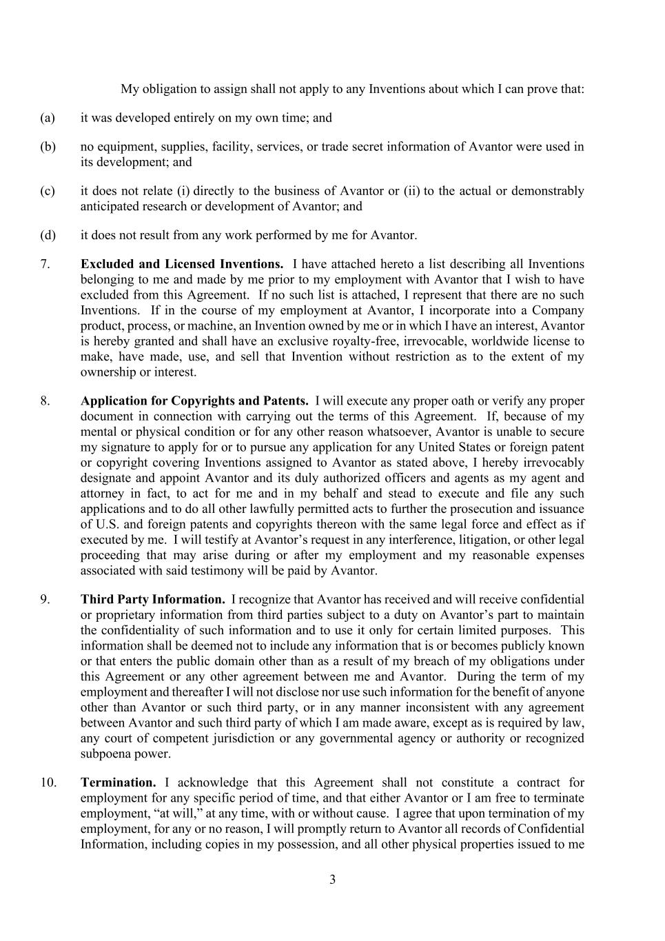 3 My obligation to assign shall not apply to any Inventions about which I can prove that: (a) it was developed entirely on my own time; and (b) no equipment, supplies, facility, services, or trade secret information of Avantor were used in its development; and (c) it does not relate (i) directly to the business of Avantor or (ii) to the actual or demonstrably anticipated research or development of Avantor; and (d) it does not result from any work performed by me for Avantor. 7. Excluded and Licensed Inventions. I have attached hereto a list describing all Inventions belonging to me and made by me prior to my employment with Avantor that I wish to have excluded from this Agreement. If no such list is attached, I represent that there are no such Inventions. If in the course of my employment at Avantor, I incorporate into a Company product, process, or machine, an Invention owned by me or in which I have an interest, Avantor is hereby granted and shall have an exclusive royalty-free, irrevocable, worldwide license to make, have made, use, and sell that Invention without restriction as to the extent of my ownership or interest. 8. Application for Copyrights and Patents. I will execute any proper oath or verify any proper document in connection with carrying out the terms of this Agreement. If, because of my mental or physical condition or for any other reason whatsoever, Avantor is unable to secure my signature to apply for or to pursue any application for any United States or foreign patent or copyright covering Inventions assigned to Avantor as stated above, I hereby irrevocably designate and appoint Avantor and its duly authorized officers and agents as my agent and attorney in fact, to act for me and in my behalf and stead to execute and file any such applications and to do all other lawfully permitted acts to further the prosecution and issuance of U.S. and foreign patents and copyrights thereon with the same legal force and effect as if executed by me. I will testify at Avantor’s request in any interference, litigation, or other legal proceeding that may arise during or after my employment and my reasonable expenses associated with said testimony will be paid by Avantor. 9. Third Party Information. I recognize that Avantor has received and will receive confidential or proprietary information from third parties subject to a duty on Avantor’s part to maintain the confidentiality of such information and to use it only for certain limited purposes. This information shall be deemed not to include any information that is or becomes publicly known or that enters the public domain other than as a result of my breach of my obligations under this Agreement or any other agreement between me and Avantor. During the term of my employment and thereafter I will not disclose nor use such information for the benefit of anyone other than Avantor or such third party, or in any manner inconsistent with any agreement between Avantor and such third party of which I am made aware, except as is required by law, any court of competent jurisdiction or any governmental agency or authority or recognized subpoena power. 10. Termination. I acknowledge that this Agreement shall not constitute a contract for employment for any specific period of time, and that either Avantor or I am free to terminate employment, “at will,” at any time, with or without cause. I agree that upon termination of my employment, for any or no reason, I will promptly return to Avantor all records of Confidential Information, including copies in my possession, and all other physical properties issued to me