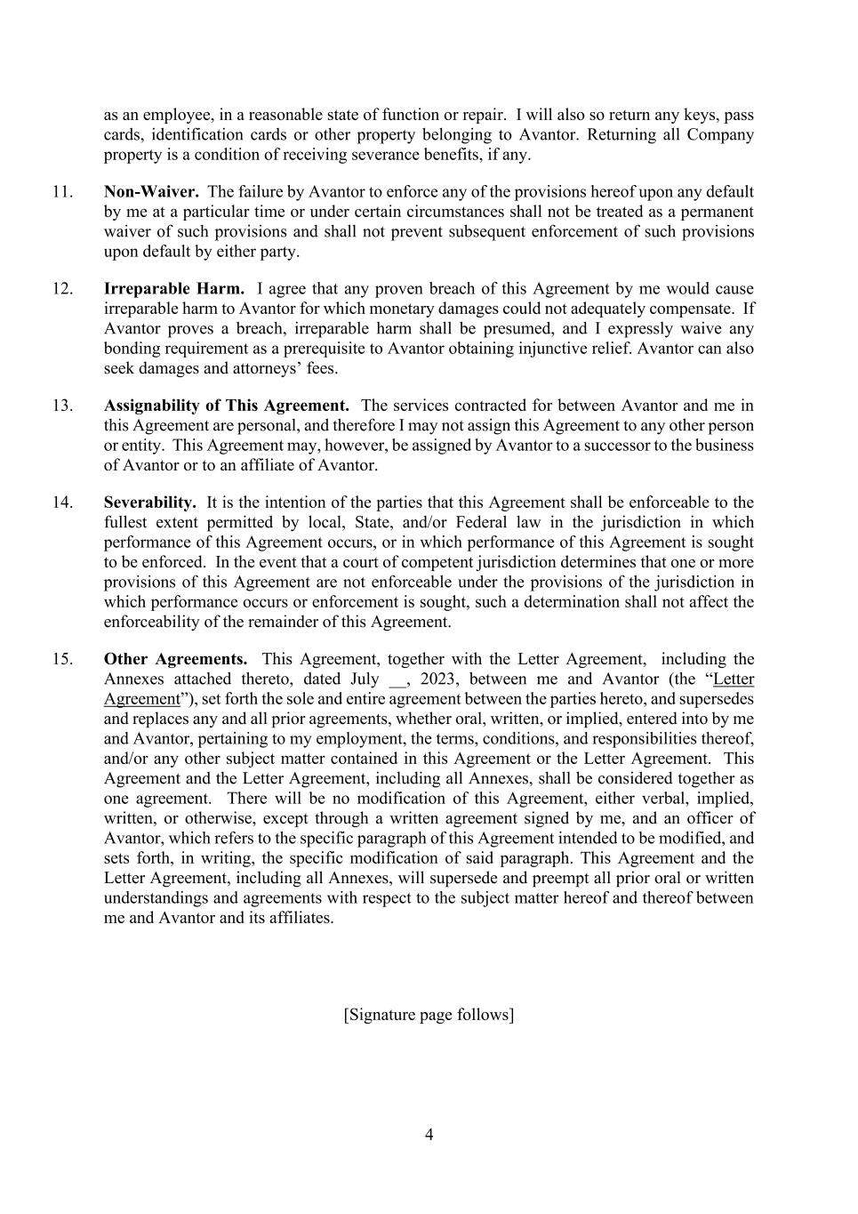 4 as an employee, in a reasonable state of function or repair. I will also so return any keys, pass cards, identification cards or other property belonging to Avantor. Returning all Company property is a condition of receiving severance benefits, if any. 11. Non-Waiver. The failure by Avantor to enforce any of the provisions hereof upon any default by me at a particular time or under certain circumstances shall not be treated as a permanent waiver of such provisions and shall not prevent subsequent enforcement of such provisions upon default by either party. 12. Irreparable Harm. I agree that any proven breach of this Agreement by me would cause irreparable harm to Avantor for which monetary damages could not adequately compensate. If Avantor proves a breach, irreparable harm shall be presumed, and I expressly waive any bonding requirement as a prerequisite to Avantor obtaining injunctive relief. Avantor can also seek damages and attorneys’ fees. 13. Assignability of This Agreement. The services contracted for between Avantor and me in this Agreement are personal, and therefore I may not assign this Agreement to any other person or entity. This Agreement may, however, be assigned by Avantor to a successor to the business of Avantor or to an affiliate of Avantor. 14. Severability. It is the intention of the parties that this Agreement shall be enforceable to the fullest extent permitted by local, State, and/or Federal law in the jurisdiction in which performance of this Agreement occurs, or in which performance of this Agreement is sought to be enforced. In the event that a court of competent jurisdiction determines that one or more provisions of this Agreement are not enforceable under the provisions of the jurisdiction in which performance occurs or enforcement is sought, such a determination shall not affect the enforceability of the remainder of this Agreement. 15. Other Agreements. This Agreement, together with the Letter Agreement, including the Annexes attached thereto, dated July __, 2023, between me and Avantor (the “Letter Agreement”), set forth the sole and entire agreement between the parties hereto, and supersedes and replaces any and all prior agreements, whether oral, written, or implied, entered into by me and Avantor, pertaining to my employment, the terms, conditions, and responsibilities thereof, and/or any other subject matter contained in this Agreement or the Letter Agreement. This Agreement and the Letter Agreement, including all Annexes, shall be considered together as one agreement. There will be no modification of this Agreement, either verbal, implied, written, or otherwise, except through a written agreement signed by me, and an officer of Avantor, which refers to the specific paragraph of this Agreement intended to be modified, and sets forth, in writing, the specific modification of said paragraph. This Agreement and the Letter Agreement, including all Annexes, will supersede and preempt all prior oral or written understandings and agreements with respect to the subject matter hereof and thereof between me and Avantor and its affiliates. [Signature page follows]