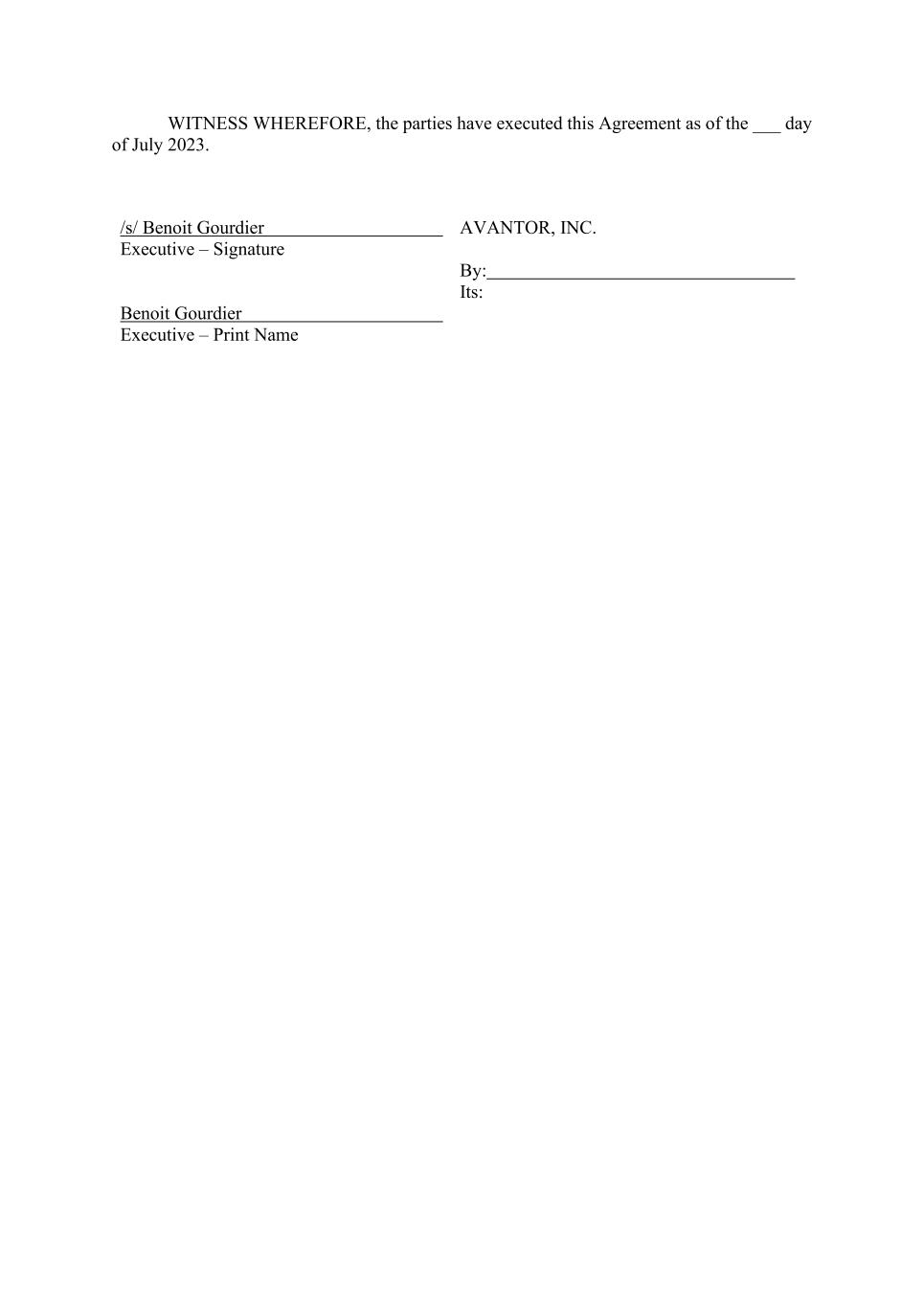 WITNESS WHEREFORE, the parties have executed this Agreement as of the ___ day of July 2023. /s/ Benoit Gourdier Executive – Signature AVANTOR, INC. Benoit Gourdier Executive – Print Name By: Its: