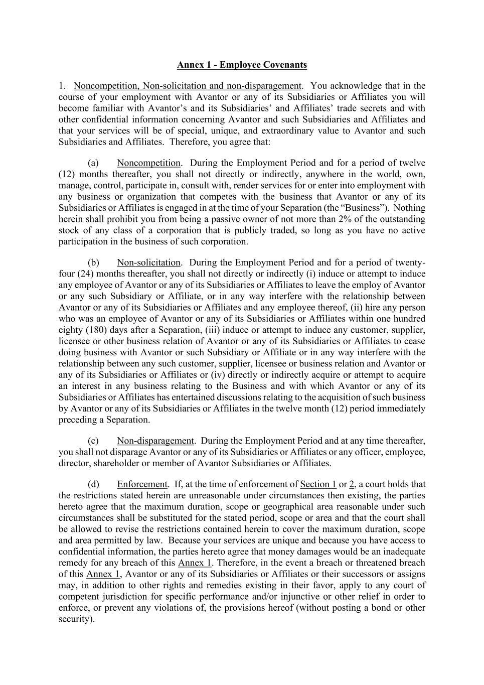Annex 1 - Employee Covenants 1. Noncompetition, Non-solicitation and non-disparagement. You acknowledge that in the course of your employment with Avantor or any of its Subsidiaries or Affiliates you will become familiar with Avantor’s and its Subsidiaries’ and Affiliates’ trade secrets and with other confidential information concerning Avantor and such Subsidiaries and Affiliates and that your services will be of special, unique, and extraordinary value to Avantor and such Subsidiaries and Affiliates. Therefore, you agree that: (a) Noncompetition. During the Employment Period and for a period of twelve (12) months thereafter, you shall not directly or indirectly, anywhere in the world, own, manage, control, participate in, consult with, render services for or enter into employment with any business or organization that competes with the business that Avantor or any of its Subsidiaries or Affiliates is engaged in at the time of your Separation (the “Business”). Nothing herein shall prohibit you from being a passive owner of not more than 2% of the outstanding stock of any class of a corporation that is publicly traded, so long as you have no active participation in the business of such corporation. (b) Non-solicitation. During the Employment Period and for a period of twenty- four (24) months thereafter, you shall not directly or indirectly (i) induce or attempt to induce any employee of Avantor or any of its Subsidiaries or Affiliates to leave the employ of Avantor or any such Subsidiary or Affiliate, or in any way interfere with the relationship between Avantor or any of its Subsidiaries or Affiliates and any employee thereof, (ii) hire any person who was an employee of Avantor or any of its Subsidiaries or Affiliates within one hundred eighty (180) days after a Separation, (iii) induce or attempt to induce any customer, supplier, licensee or other business relation of Avantor or any of its Subsidiaries or Affiliates to cease doing business with Avantor or such Subsidiary or Affiliate or in any way interfere with the relationship between any such customer, supplier, licensee or business relation and Avantor or any of its Subsidiaries or Affiliates or (iv) directly or indirectly acquire or attempt to acquire an interest in any business relating to the Business and with which Avantor or any of its Subsidiaries or Affiliates has entertained discussions relating to the acquisition of such business by Avantor or any of its Subsidiaries or Affiliates in the twelve month (12) period immediately preceding a Separation. (c) Non-disparagement. During the Employment Period and at any time thereafter, you shall not disparage Avantor or any of its Subsidiaries or Affiliates or any officer, employee, director, shareholder or member of Avantor Subsidiaries or Affiliates. (d) Enforcement. If, at the time of enforcement of Section 1 or 2, a court holds that the restrictions stated herein are unreasonable under circumstances then existing, the parties hereto agree that the maximum duration, scope or geographical area reasonable under such circumstances shall be substituted for the stated period, scope or area and that the court shall be allowed to revise the restrictions contained herein to cover the maximum duration, scope and area permitted by law. Because your services are unique and because you have access to confidential information, the parties hereto agree that money damages would be an inadequate remedy for any breach of this Annex 1. Therefore, in the event a breach or threatened breach of this Annex 1, Avantor or any of its Subsidiaries or Affiliates or their successors or assigns may, in addition to other rights and remedies existing in their favor, apply to any court of competent jurisdiction for specific performance and/or injunctive or other relief in order to enforce, or prevent any violations of, the provisions hereof (without posting a bond or other security).