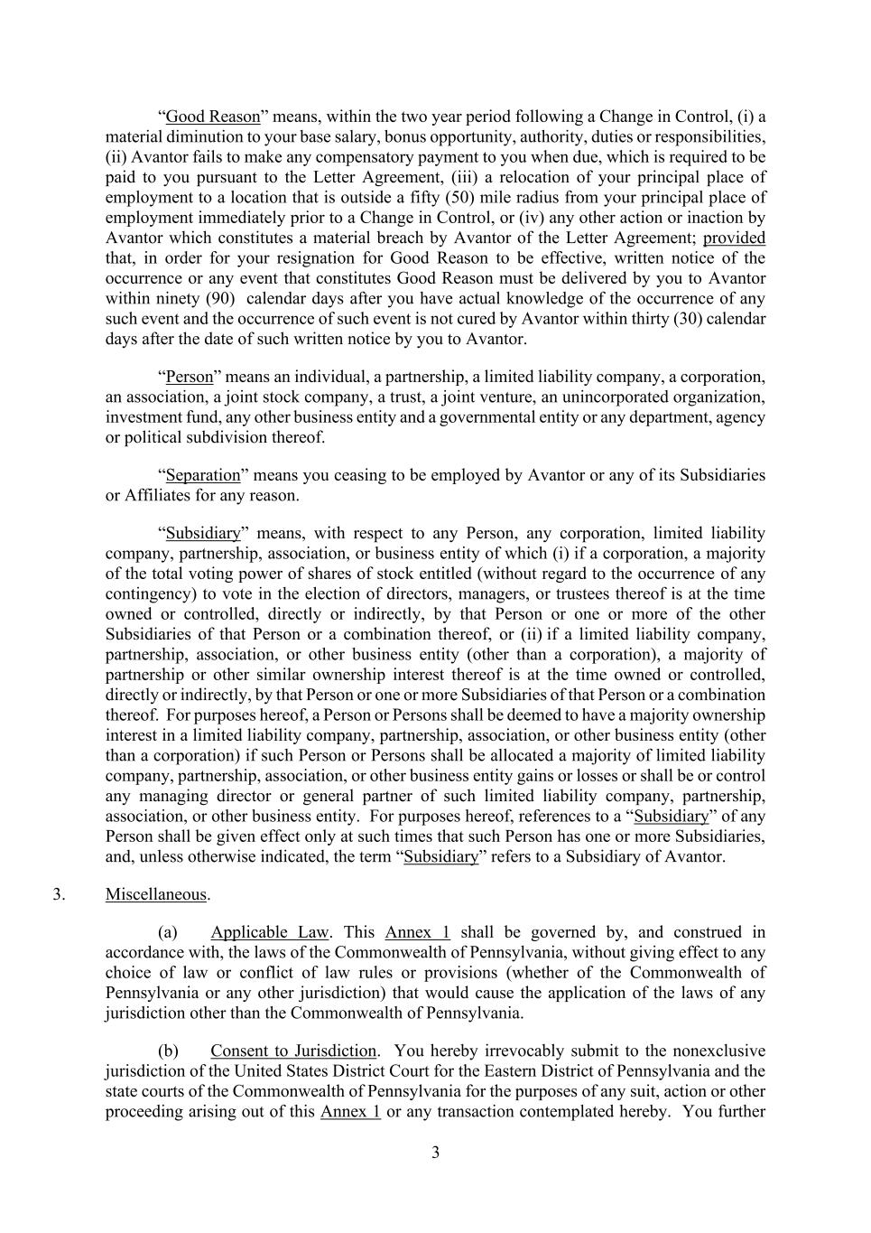 3 “Good Reason” means, within the two year period following a Change in Control, (i) a material diminution to your base salary, bonus opportunity, authority, duties or responsibilities, (ii) Avantor fails to make any compensatory payment to you when due, which is required to be paid to you pursuant to the Letter Agreement, (iii) a relocation of your principal place of employment to a location that is outside a fifty (50) mile radius from your principal place of employment immediately prior to a Change in Control, or (iv) any other action or inaction by Avantor which constitutes a material breach by Avantor of the Letter Agreement; provided that, in order for your resignation for Good Reason to be effective, written notice of the occurrence or any event that constitutes Good Reason must be delivered by you to Avantor within ninety (90) calendar days after you have actual knowledge of the occurrence of any such event and the occurrence of such event is not cured by Avantor within thirty (30) calendar days after the date of such written notice by you to Avantor. “Person” means an individual, a partnership, a limited liability company, a corporation, an association, a joint stock company, a trust, a joint venture, an unincorporated organization, investment fund, any other business entity and a governmental entity or any department, agency or political subdivision thereof. “Separation” means you ceasing to be employed by Avantor or any of its Subsidiaries or Affiliates for any reason. “Subsidiary” means, with respect to any Person, any corporation, limited liability company, partnership, association, or business entity of which (i) if a corporation, a majority of the total voting power of shares of stock entitled (without regard to the occurrence of any contingency) to vote in the election of directors, managers, or trustees thereof is at the time owned or controlled, directly or indirectly, by that Person or one or more of the other Subsidiaries of that Person or a combination thereof, or (ii) if a limited liability company, partnership, association, or other business entity (other than a corporation), a majority of partnership or other similar ownership interest thereof is at the time owned or controlled, directly or indirectly, by that Person or one or more Subsidiaries of that Person or a combination thereof. For purposes hereof, a Person or Persons shall be deemed to have a majority ownership interest in a limited liability company, partnership, association, or other business entity (other than a corporation) if such Person or Persons shall be allocated a majority of limited liability company, partnership, association, or other business entity gains or losses or shall be or control any managing director or general partner of such limited liability company, partnership, association, or other business entity. For purposes hereof, references to a “Subsidiary” of any Person shall be given effect only at such times that such Person has one or more Subsidiaries, and, unless otherwise indicated, the term “Subsidiary” refers to a Subsidiary of Avantor. 3. Miscellaneous. (a) Applicable Law. This Annex 1 shall be governed by, and construed in accordance with, the laws of the Commonwealth of Pennsylvania, without giving effect to any choice of law or conflict of law rules or provisions (whether of the Commonwealth of Pennsylvania or any other jurisdiction) that would cause the application of the laws of any jurisdiction other than the Commonwealth of Pennsylvania. (b) Consent to Jurisdiction. You hereby irrevocably submit to the nonexclusive jurisdiction of the United States District Court for the Eastern District of Pennsylvania and the state courts of the Commonwealth of Pennsylvania for the purposes of any suit, action or other proceeding arising out of this Annex 1 or any transaction contemplated hereby. You further