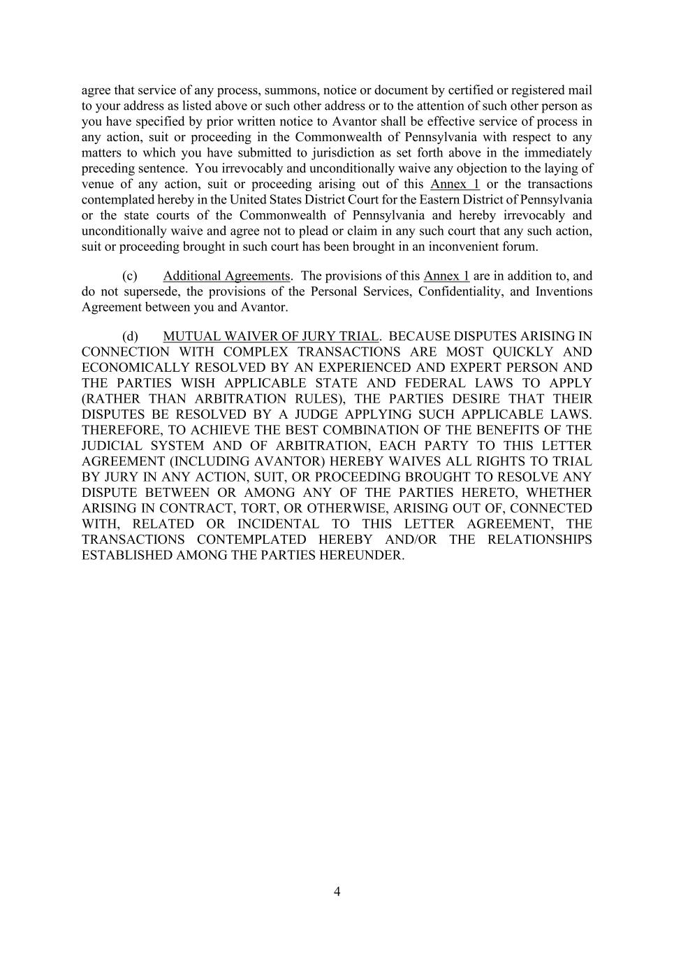 4 agree that service of any process, summons, notice or document by certified or registered mail to your address as listed above or such other address or to the attention of such other person as you have specified by prior written notice to Avantor shall be effective service of process in any action, suit or proceeding in the Commonwealth of Pennsylvania with respect to any matters to which you have submitted to jurisdiction as set forth above in the immediately preceding sentence. You irrevocably and unconditionally waive any objection to the laying of venue of any action, suit or proceeding arising out of this Annex 1 or the transactions contemplated hereby in the United States District Court for the Eastern District of Pennsylvania or the state courts of the Commonwealth of Pennsylvania and hereby irrevocably and unconditionally waive and agree not to plead or claim in any such court that any such action, suit or proceeding brought in such court has been brought in an inconvenient forum. (c) Additional Agreements. The provisions of this Annex 1 are in addition to, and do not supersede, the provisions of the Personal Services, Confidentiality, and Inventions Agreement between you and Avantor. (d) MUTUAL WAIVER OF JURY TRIAL. BECAUSE DISPUTES ARISING IN CONNECTION WITH COMPLEX TRANSACTIONS ARE MOST QUICKLY AND ECONOMICALLY RESOLVED BY AN EXPERIENCED AND EXPERT PERSON AND THE PARTIES WISH APPLICABLE STATE AND FEDERAL LAWS TO APPLY (RATHER THAN ARBITRATION RULES), THE PARTIES DESIRE THAT THEIR DISPUTES BE RESOLVED BY A JUDGE APPLYING SUCH APPLICABLE LAWS. THEREFORE, TO ACHIEVE THE BEST COMBINATION OF THE BENEFITS OF THE JUDICIAL SYSTEM AND OF ARBITRATION, EACH PARTY TO THIS LETTER AGREEMENT (INCLUDING AVANTOR) HEREBY WAIVES ALL RIGHTS TO TRIAL BY JURY IN ANY ACTION, SUIT, OR PROCEEDING BROUGHT TO RESOLVE ANY DISPUTE BETWEEN OR AMONG ANY OF THE PARTIES HERETO, WHETHER ARISING IN CONTRACT, TORT, OR OTHERWISE, ARISING OUT OF, CONNECTED WITH, RELATED OR INCIDENTAL TO THIS LETTER AGREEMENT, THE TRANSACTIONS CONTEMPLATED HEREBY AND/OR THE RELATIONSHIPS ESTABLISHED AMONG THE PARTIES HEREUNDER.