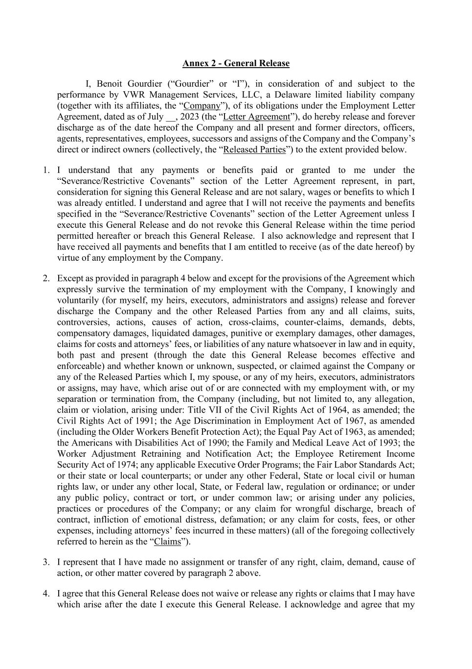 Annex 2 - General Release I, Benoit Gourdier (“Gourdier” or “I”), in consideration of and subject to the performance by VWR Management Services, LLC, a Delaware limited liability company (together with its affiliates, the “Company”), of its obligations under the Employment Letter Agreement, dated as of July __, 2023 (the “Letter Agreement”), do hereby release and forever discharge as of the date hereof the Company and all present and former directors, officers, agents, representatives, employees, successors and assigns of the Company and the Company’s direct or indirect owners (collectively, the “Released Parties”) to the extent provided below. 1. I understand that any payments or benefits paid or granted to me under the “Severance/Restrictive Covenants” section of the Letter Agreement represent, in part, consideration for signing this General Release and are not salary, wages or benefits to which I was already entitled. I understand and agree that I will not receive the payments and benefits specified in the “Severance/Restrictive Covenants” section of the Letter Agreement unless I execute this General Release and do not revoke this General Release within the time period permitted hereafter or breach this General Release. I also acknowledge and represent that I have received all payments and benefits that I am entitled to receive (as of the date hereof) by virtue of any employment by the Company. 2. Except as provided in paragraph 4 below and except for the provisions of the Agreement which expressly survive the termination of my employment with the Company, I knowingly and voluntarily (for myself, my heirs, executors, administrators and assigns) release and forever discharge the Company and the other Released Parties from any and all claims, suits, controversies, actions, causes of action, cross-claims, counter-claims, demands, debts, compensatory damages, liquidated damages, punitive or exemplary damages, other damages, claims for costs and attorneys’ fees, or liabilities of any nature whatsoever in law and in equity, both past and present (through the date this General Release becomes effective and enforceable) and whether known or unknown, suspected, or claimed against the Company or any of the Released Parties which I, my spouse, or any of my heirs, executors, administrators or assigns, may have, which arise out of or are connected with my employment with, or my separation or termination from, the Company (including, but not limited to, any allegation, claim or violation, arising under: Title VII of the Civil Rights Act of 1964, as amended; the Civil Rights Act of 1991; the Age Discrimination in Employment Act of 1967, as amended (including the Older Workers Benefit Protection Act); the Equal Pay Act of 1963, as amended; the Americans with Disabilities Act of 1990; the Family and Medical Leave Act of 1993; the Worker Adjustment Retraining and Notification Act; the Employee Retirement Income Security Act of 1974; any applicable Executive Order Programs; the Fair Labor Standards Act; or their state or local counterparts; or under any other Federal, State or local civil or human rights law, or under any other local, State, or Federal law, regulation or ordinance; or under any public policy, contract or tort, or under common law; or arising under any policies, practices or procedures of the Company; or any claim for wrongful discharge, breach of contract, infliction of emotional distress, defamation; or any claim for costs, fees, or other expenses, including attorneys’ fees incurred in these matters) (all of the foregoing collectively referred to herein as the “Claims”). 3. I represent that I have made no assignment or transfer of any right, claim, demand, cause of action, or other matter covered by paragraph 2 above. 4. I agree that this General Release does not waive or release any rights or claims that I may have which arise after the date I execute this General Release. I acknowledge and agree that my