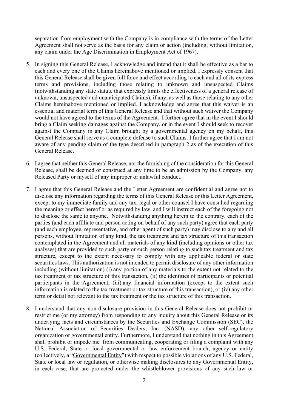 2 separation from employment with the Company is in compliance with the terms of the Letter Agreement shall not serve as the basis for any claim or action (including, without limitation, any claim under the Age Discrimination in Employment Act of 1967). 5. In signing this General Release, I acknowledge and intend that it shall be effective as a bar to each and every one of the Claims hereinabove mentioned or implied. I expressly consent that this General Release shall be given full force and effect according to each and all of its express terms and provisions, including those relating to unknown and unsuspected Claims (notwithstanding any state statute that expressly limits the effectiveness of a general release of unknown, unsuspected and unanticipated Claims), if any, as well as those relating to any other Claims hereinabove mentioned or implied. I acknowledge and agree that this waiver is an essential and material term of this General Release and that without such waiver the Company would not have agreed to the terms of the Agreement. I further agree that in the event I should bring a Claim seeking damages against the Company, or in the event I should seek to recover against the Company in any Claim brought by a governmental agency on my behalf, this General Release shall serve as a complete defense to such Claims. I further agree that I am not aware of any pending claim of the type described in paragraph 2 as of the execution of this General Release. 6. I agree that neither this General Release, nor the furnishing of the consideration for this General Release, shall be deemed or construed at any time to be an admission by the Company, any Released Party or myself of any improper or unlawful conduct. 7. I agree that this General Release and the Letter Agreement are confidential and agree not to disclose any information regarding the terms of this General Release or this Letter Agreement, except to my immediate family and any tax, legal or other counsel I have consulted regarding the meaning or effect hereof or as required by law, and I will instruct each of the foregoing not to disclose the same to anyone. Notwithstanding anything herein to the contrary, each of the parties (and each affiliate and person acting on behalf of any such party) agree that each party (and each employee, representative, and other agent of such party) may disclose to any and all persons, without limitation of any kind, the tax treatment and tax structure of this transaction contemplated in the Agreement and all materials of any kind (including opinions or other tax analyses) that are provided to such party or such person relating to such tax treatment and tax structure, except to the extent necessary to comply with any applicable federal or state securities laws. This authorization is not intended to permit disclosure of any other information including (without limitation) (i) any portion of any materials to the extent not related to the tax treatment or tax structure of this transaction, (ii) the identities of participants or potential participants in the Agreement, (iii) any financial information (except to the extent such information is related to the tax treatment or tax structure of this transaction), or (iv) any other term or detail not relevant to the tax treatment or the tax structure of this transaction. 8. I understand that any non-disclosure provision in this General Release does not prohibit or restrict me (or my attorney) from responding to any inquiry about this General Release or its underlying facts and circumstances by the Securities and Exchange Commission (SEC), the National Association of Securities Dealers, Inc. (NASD), any other self-regulatory organization or governmental entity. Furthermore, I understand that nothing in this Agreement shall prohibit or impede me from communicating, cooperating or filing a complaint with any U.S. Federal, State or local governmental or law enforcement branch, agency or entity (collectively, a “Governmental Entity”) with respect to possible violations of any U.S. Federal, State or local law or regulation, or otherwise making disclosures to any Governmental Entity, in each case, that are protected under the whistleblower provisions of any such law or