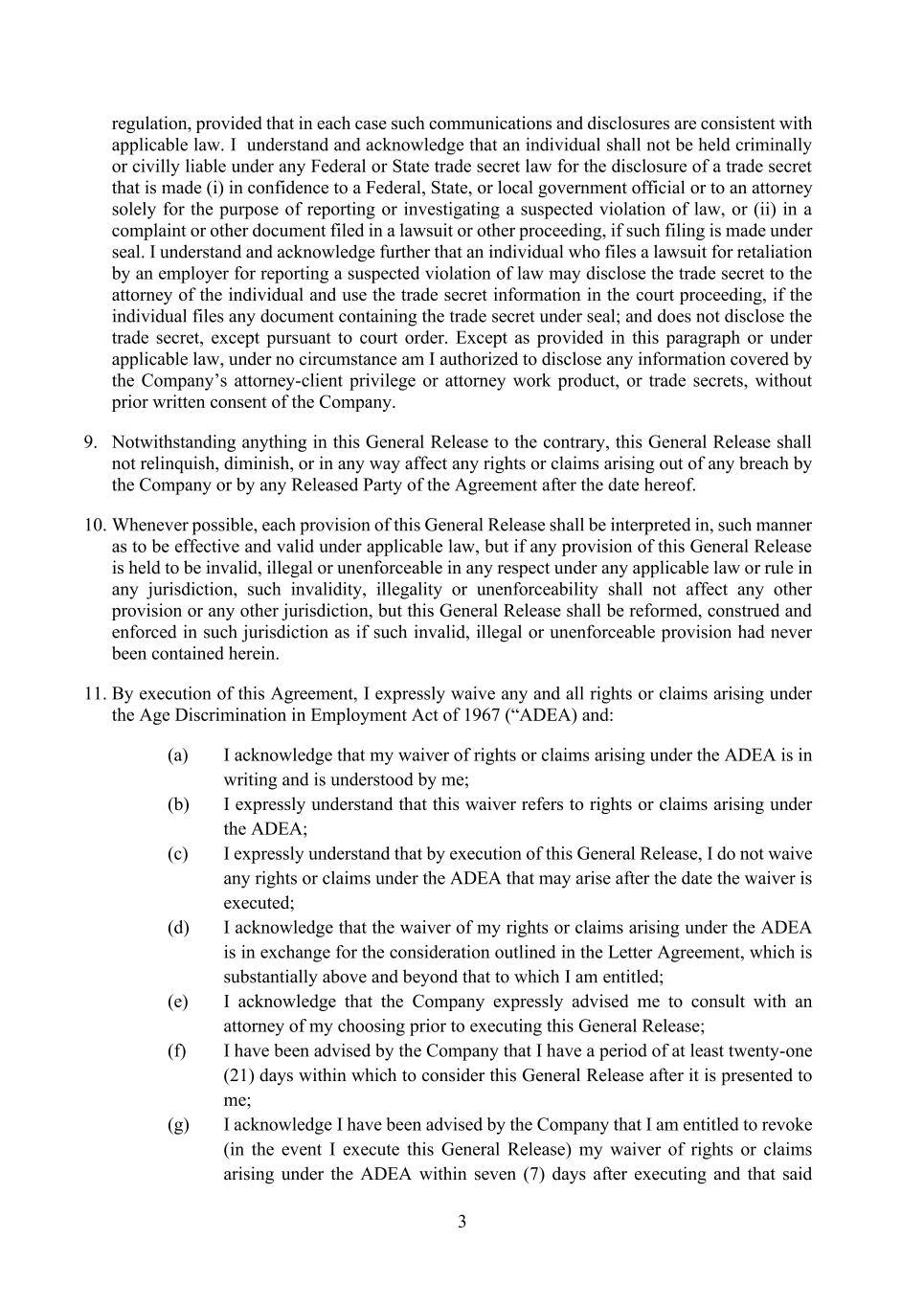 3 regulation, provided that in each case such communications and disclosures are consistent with applicable law. I understand and acknowledge that an individual shall not be held criminally or civilly liable under any Federal or State trade secret law for the disclosure of a trade secret that is made (i) in confidence to a Federal, State, or local government official or to an attorney solely for the purpose of reporting or investigating a suspected violation of law, or (ii) in a complaint or other document filed in a lawsuit or other proceeding, if such filing is made under seal. I understand and acknowledge further that an individual who files a lawsuit for retaliation by an employer for reporting a suspected violation of law may disclose the trade secret to the attorney of the individual and use the trade secret information in the court proceeding, if the individual files any document containing the trade secret under seal; and does not disclose the trade secret, except pursuant to court order. Except as provided in this paragraph or under applicable law, under no circumstance am I authorized to disclose any information covered by the Company’s attorney-client privilege or attorney work product, or trade secrets, without prior written consent of the Company. 9. Notwithstanding anything in this General Release to the contrary, this General Release shall not relinquish, diminish, or in any way affect any rights or claims arising out of any breach by the Company or by any Released Party of the Agreement after the date hereof. 10. Whenever possible, each provision of this General Release shall be interpreted in, such manner as to be effective and valid under applicable law, but if any provision of this General Release is held to be invalid, illegal or unenforceable in any respect under any applicable law or rule in any jurisdiction, such invalidity, illegality or unenforceability shall not affect any other provision or any other jurisdiction, but this General Release shall be reformed, construed and enforced in such jurisdiction as if such invalid, illegal or unenforceable provision had never been contained herein. 11. By execution of this Agreement, I expressly waive any and all rights or claims arising under the Age Discrimination in Employment Act of 1967 (“ADEA) and: (a) I acknowledge that my waiver of rights or claims arising under the ADEA is in writing and is understood by me; (b) I expressly understand that this waiver refers to rights or claims arising under the ADEA; (c) I expressly understand that by execution of this General Release, I do not waive any rights or claims under the ADEA that may arise after the date the waiver is executed; (d) I acknowledge that the waiver of my rights or claims arising under the ADEA is in exchange for the consideration outlined in the Letter Agreement, which is substantially above and beyond that to which I am entitled; (e) I acknowledge that the Company expressly advised me to consult with an attorney of my choosing prior to executing this General Release; (f) I have been advised by the Company that I have a period of at least twenty-one (21) days within which to consider this General Release after it is presented to me; (g) I acknowledge I have been advised by the Company that I am entitled to revoke (in the event I execute this General Release) my waiver of rights or claims arising under the ADEA within seven (7) days after executing and that said