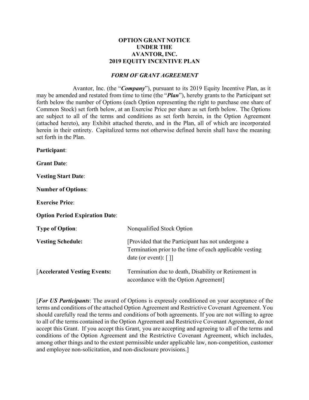 OPTION GRANT NOTICE UNDER THE AVANTOR, INC. 2019 EQUITY INCENTIVE PLAN FORM OF GRANT AGREEMENT Avantor, Inc. (the “Company”), pursuant to its 2019 Equity Incentive Plan, as it may be amended and restated from time to time (the “Plan”), hereby grants to the Participant set forth below the number of Options (each Option representing the right to purchase one share of Common Stock) set forth below, at an Exercise Price per share as set forth below. The Options are subject to all of the terms and conditions as set forth herein, in the Option Agreement (attached hereto), any Exhibit attached thereto, and in the Plan, all of which are incorporated herein in their entirety. Capitalized terms not otherwise defined herein shall have the meaning set forth in the Plan. Participant: Grant Date: Vesting Start Date: Number of Options: Exercise Price: Option Period Expiration Date: Type of Option: Nonqualified Stock Option Vesting Schedule: [Provided that the Participant has not undergone a Termination prior to the time of each applicable vesting date (or event): [ ]] [Accelerated Vesting Events: Termination due to death, Disability or Retirement in accordance with the Option Agreement] [For US Participants: The award of Options is expressly conditioned on your acceptance of the terms and conditions of the attached Option Agreement and Restrictive Covenant Agreement. You should carefully read the terms and conditions of both agreements. If you are not willing to agree to all of the terms contained in the Option Agreement and Restrictive Covenant Agreement, do not accept this Grant. If you accept this Grant, you are accepting and agreeing to all of the terms and conditions of the Option Agreement and the Restrictive Covenant Agreement, which includes, among other things and to the extent permissible under applicable law, non-competition, customer and employee non-solicitation, and non-disclosure provisions.]