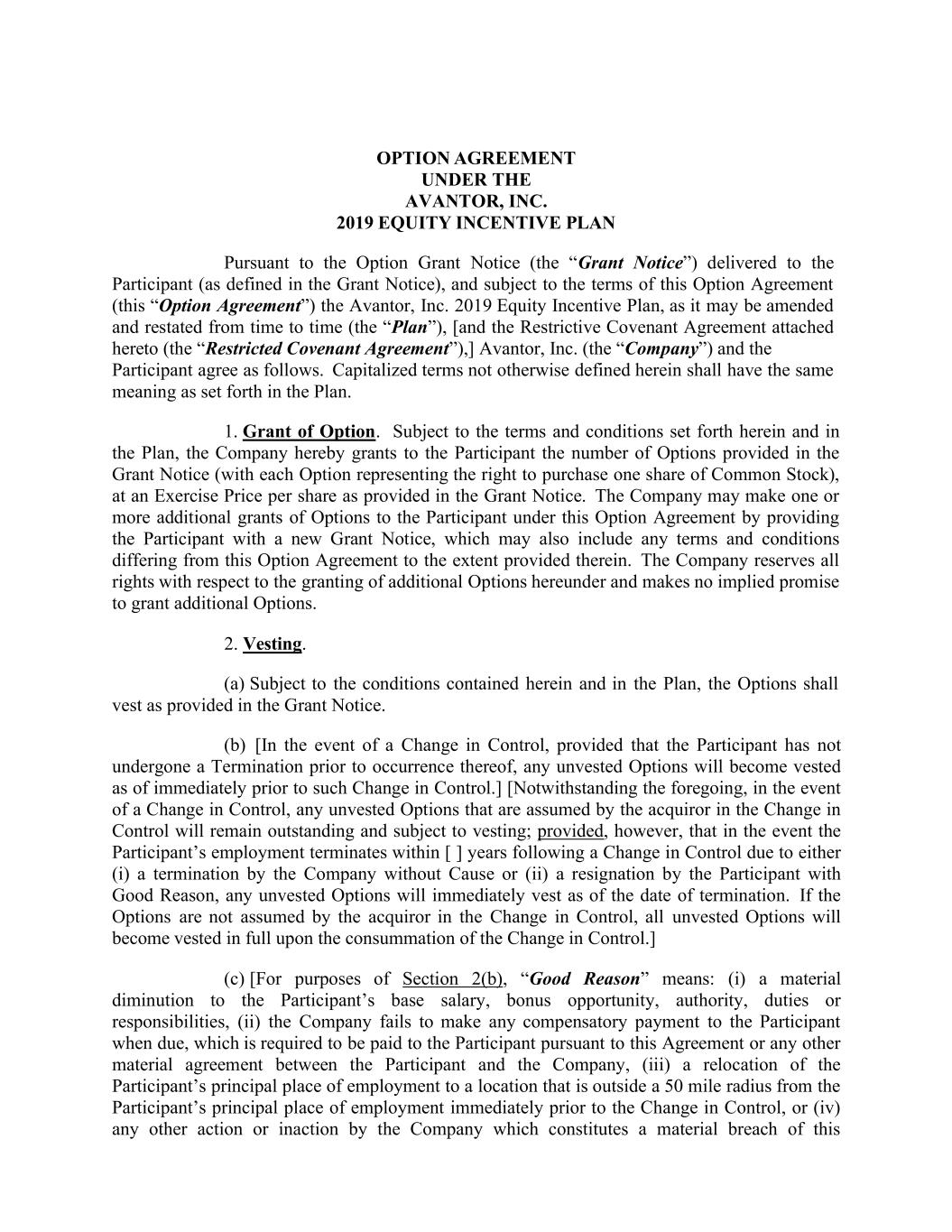 OPTION AGREEMENT UNDER THE AVANTOR, INC. 2019 EQUITY INCENTIVE PLAN Pursuant to the Option Grant Notice (the “Grant Notice”) delivered to the Participant (as defined in the Grant Notice), and subject to the terms of this Option Agreement (this “Option Agreement”) the Avantor, Inc. 2019 Equity Incentive Plan, as it may be amended and restated from time to time (the “Plan”), [and the Restrictive Covenant Agreement attached hereto (the “Restricted Covenant Agreement”),] Avantor, Inc. (the “Company”) and the Participant agree as follows. Capitalized terms not otherwise defined herein shall have the same meaning as set forth in the Plan. 1. Grant of Option. Subject to the terms and conditions set forth herein and in the Plan, the Company hereby grants to the Participant the number of Options provided in the Grant Notice (with each Option representing the right to purchase one share of Common Stock), at an Exercise Price per share as provided in the Grant Notice. The Company may make one or more additional grants of Options to the Participant under this Option Agreement by providing the Participant with a new Grant Notice, which may also include any terms and conditions differing from this Option Agreement to the extent provided therein. The Company reserves all rights with respect to the granting of additional Options hereunder and makes no implied promise to grant additional Options. 2. Vesting. (a) Subject to the conditions contained herein and in the Plan, the Options shall vest as provided in the Grant Notice. (b) [In the event of a Change in Control, provided that the Participant has not undergone a Termination prior to occurrence thereof, any unvested Options will become vested as of immediately prior to such Change in Control.] [Notwithstanding the foregoing, in the event of a Change in Control, any unvested Options that are assumed by the acquiror in the Change in Control will remain outstanding and subject to vesting; provided, however, that in the event the Participant’s employment terminates within [ ] years following a Change in Control due to either (i) a termination by the Company without Cause or (ii) a resignation by the Participant with Good Reason, any unvested Options will immediately vest as of the date of termination. If the Options are not assumed by the acquiror in the Change in Control, all unvested Options will become vested in full upon the consummation of the Change in Control.] (c) [For purposes of Section 2(b), “Good Reason” means: (i) a material diminution to the Participant’s base salary, bonus opportunity, authority, duties or responsibilities, (ii) the Company fails to make any compensatory payment to the Participant when due, which is required to be paid to the Participant pursuant to this Agreement or any other material agreement between the Participant and the Company, (iii) a relocation of the Participant’s principal place of employment to a location that is outside a 50 mile radius from the Participant’s principal place of employment immediately prior to the Change in Control, or (iv) any other action or inaction by the Company which constitutes a material breach of this