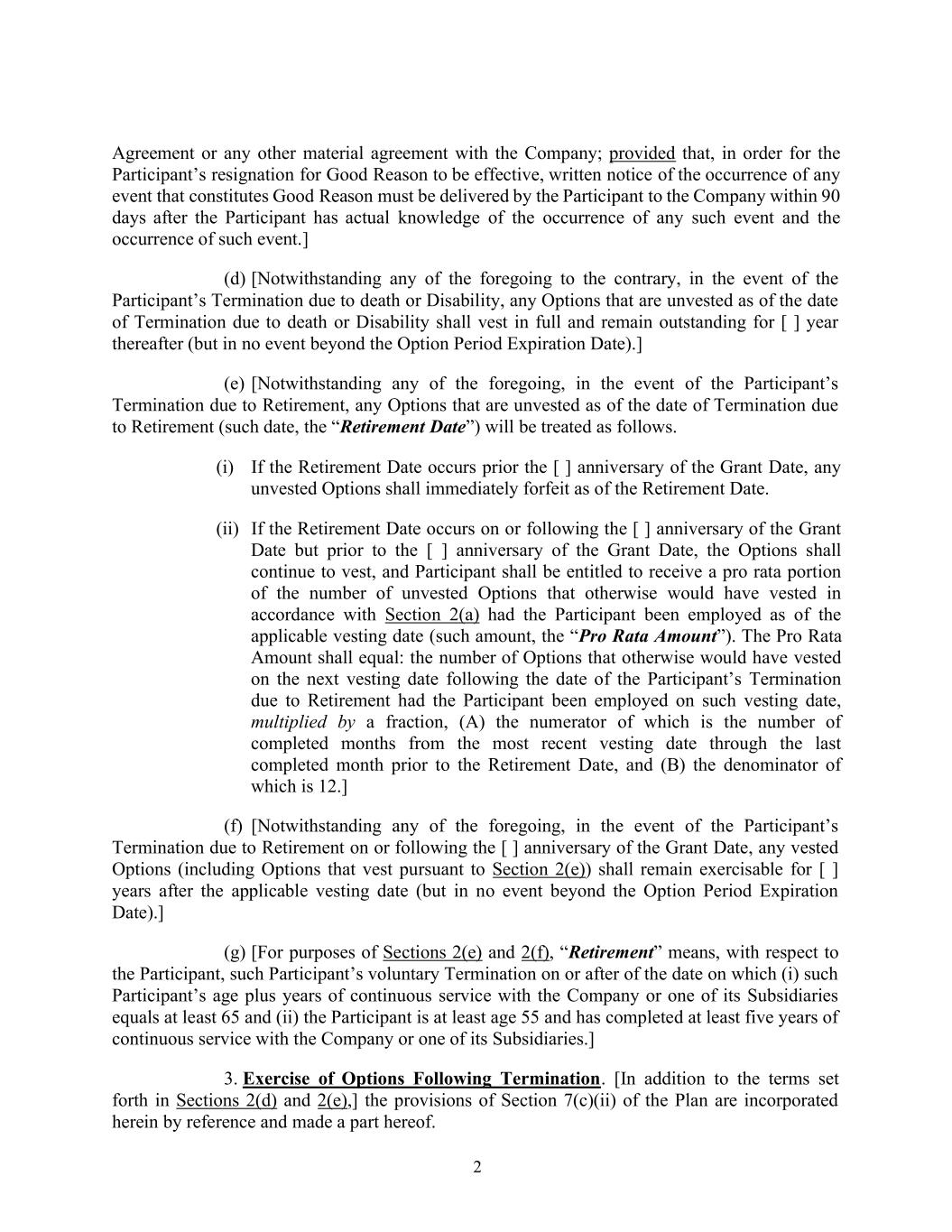 2 Agreement or any other material agreement with the Company; provided that, in order for the Participant’s resignation for Good Reason to be effective, written notice of the occurrence of any event that constitutes Good Reason must be delivered by the Participant to the Company within 90 days after the Participant has actual knowledge of the occurrence of any such event and the occurrence of such event.] (d) [Notwithstanding any of the foregoing to the contrary, in the event of the Participant’s Termination due to death or Disability, any Options that are unvested as of the date of Termination due to death or Disability shall vest in full and remain outstanding for [ ] year thereafter (but in no event beyond the Option Period Expiration Date).] (e) [Notwithstanding any of the foregoing, in the event of the Participant’s Termination due to Retirement, any Options that are unvested as of the date of Termination due to Retirement (such date, the “Retirement Date”) will be treated as follows. (i) If the Retirement Date occurs prior the [ ] anniversary of the Grant Date, any unvested Options shall immediately forfeit as of the Retirement Date. (ii) If the Retirement Date occurs on or following the [ ] anniversary of the Grant Date but prior to the [ ] anniversary of the Grant Date, the Options shall continue to vest, and Participant shall be entitled to receive a pro rata portion of the number of unvested Options that otherwise would have vested in accordance with Section 2(a) had the Participant been employed as of the applicable vesting date (such amount, the “Pro Rata Amount”). The Pro Rata Amount shall equal: the number of Options that otherwise would have vested on the next vesting date following the date of the Participant’s Termination due to Retirement had the Participant been employed on such vesting date, multiplied by a fraction, (A) the numerator of which is the number of completed months from the most recent vesting date through the last completed month prior to the Retirement Date, and (B) the denominator of which is 12.] (f) [Notwithstanding any of the foregoing, in the event of the Participant’s Termination due to Retirement on or following the [ ] anniversary of the Grant Date, any vested Options (including Options that vest pursuant to Section 2(e)) shall remain exercisable for [ ] years after the applicable vesting date (but in no event beyond the Option Period Expiration Date).] (g) [For purposes of Sections 2(e) and 2(f), “Retirement” means, with respect to the Participant, such Participant’s voluntary Termination on or after of the date on which (i) such Participant’s age plus years of continuous service with the Company or one of its Subsidiaries equals at least 65 and (ii) the Participant is at least age 55 and has completed at least five years of continuous service with the Company or one of its Subsidiaries.] 3. Exercise of Options Following Termination. [In addition to the terms set forth in Sections 2(d) and 2(e),] the provisions of Section 7(c)(ii) of the Plan are incorporated herein by reference and made a part hereof.