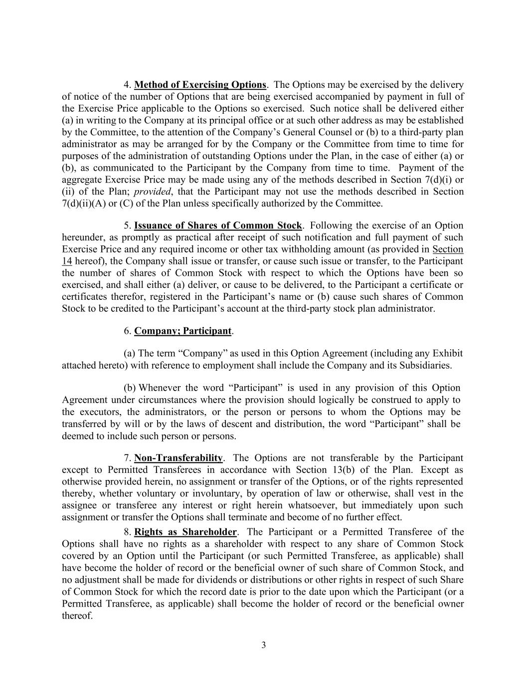 3 4. Method of Exercising Options. The Options may be exercised by the delivery of notice of the number of Options that are being exercised accompanied by payment in full of the Exercise Price applicable to the Options so exercised. Such notice shall be delivered either (a) in writing to the Company at its principal office or at such other address as may be established by the Committee, to the attention of the Company’s General Counsel or (b) to a third-party plan administrator as may be arranged for by the Company or the Committee from time to time for purposes of the administration of outstanding Options under the Plan, in the case of either (a) or (b), as communicated to the Participant by the Company from time to time. Payment of the aggregate Exercise Price may be made using any of the methods described in Section 7(d)(i) or (ii) of the Plan; provided, that the Participant may not use the methods described in Section 7(d)(ii)(A) or (C) of the Plan unless specifically authorized by the Committee. 5. Issuance of Shares of Common Stock. Following the exercise of an Option hereunder, as promptly as practical after receipt of such notification and full payment of such Exercise Price and any required income or other tax withholding amount (as provided in Section 14 hereof), the Company shall issue or transfer, or cause such issue or transfer, to the Participant the number of shares of Common Stock with respect to which the Options have been so exercised, and shall either (a) deliver, or cause to be delivered, to the Participant a certificate or certificates therefor, registered in the Participant’s name or (b) cause such shares of Common Stock to be credited to the Participant’s account at the third-party stock plan administrator. 6. Company; Participant. (a) The term “Company” as used in this Option Agreement (including any Exhibit attached hereto) with reference to employment shall include the Company and its Subsidiaries. (b) Whenever the word “Participant” is used in any provision of this Option Agreement under circumstances where the provision should logically be construed to apply to the executors, the administrators, or the person or persons to whom the Options may be transferred by will or by the laws of descent and distribution, the word “Participant” shall be deemed to include such person or persons. 7. Non-Transferability. The Options are not transferable by the Participant except to Permitted Transferees in accordance with Section 13(b) of the Plan. Except as otherwise provided herein, no assignment or transfer of the Options, or of the rights represented thereby, whether voluntary or involuntary, by operation of law or otherwise, shall vest in the assignee or transferee any interest or right herein whatsoever, but immediately upon such assignment or transfer the Options shall terminate and become of no further effect. 8. Rights as Shareholder. The Participant or a Permitted Transferee of the Options shall have no rights as a shareholder with respect to any share of Common Stock covered by an Option until the Participant (or such Permitted Transferee, as applicable) shall have become the holder of record or the beneficial owner of such share of Common Stock, and no adjustment shall be made for dividends or distributions or other rights in respect of such Share of Common Stock for which the record date is prior to the date upon which the Participant (or a Permitted Transferee, as applicable) shall become the holder of record or the beneficial owner thereof.