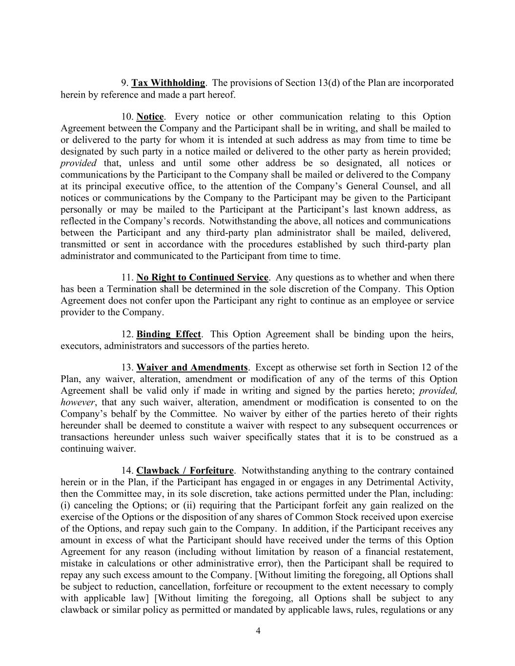 4 9. Tax Withholding. The provisions of Section 13(d) of the Plan are incorporated herein by reference and made a part hereof. 10. Notice. Every notice or other communication relating to this Option Agreement between the Company and the Participant shall be in writing, and shall be mailed to or delivered to the party for whom it is intended at such address as may from time to time be designated by such party in a notice mailed or delivered to the other party as herein provided; provided that, unless and until some other address be so designated, all notices or communications by the Participant to the Company shall be mailed or delivered to the Company at its principal executive office, to the attention of the Company’s General Counsel, and all notices or communications by the Company to the Participant may be given to the Participant personally or may be mailed to the Participant at the Participant’s last known address, as reflected in the Company’s records. Notwithstanding the above, all notices and communications between the Participant and any third-party plan administrator shall be mailed, delivered, transmitted or sent in accordance with the procedures established by such third-party plan administrator and communicated to the Participant from time to time. 11. No Right to Continued Service. Any questions as to whether and when there has been a Termination shall be determined in the sole discretion of the Company. This Option Agreement does not confer upon the Participant any right to continue as an employee or service provider to the Company. 12. Binding Effect. This Option Agreement shall be binding upon the heirs, executors, administrators and successors of the parties hereto. 13. Waiver and Amendments. Except as otherwise set forth in Section 12 of the Plan, any waiver, alteration, amendment or modification of any of the terms of this Option Agreement shall be valid only if made in writing and signed by the parties hereto; provided, however, that any such waiver, alteration, amendment or modification is consented to on the Company’s behalf by the Committee. No waiver by either of the parties hereto of their rights hereunder shall be deemed to constitute a waiver with respect to any subsequent occurrences or transactions hereunder unless such waiver specifically states that it is to be construed as a continuing waiver. 14. Clawback / Forfeiture. Notwithstanding anything to the contrary contained herein or in the Plan, if the Participant has engaged in or engages in any Detrimental Activity, then the Committee may, in its sole discretion, take actions permitted under the Plan, including: (i) canceling the Options; or (ii) requiring that the Participant forfeit any gain realized on the exercise of the Options or the disposition of any shares of Common Stock received upon exercise of the Options, and repay such gain to the Company. In addition, if the Participant receives any amount in excess of what the Participant should have received under the terms of this Option Agreement for any reason (including without limitation by reason of a financial restatement, mistake in calculations or other administrative error), then the Participant shall be required to repay any such excess amount to the Company. [Without limiting the foregoing, all Options shall be subject to reduction, cancellation, forfeiture or recoupment to the extent necessary to comply with applicable law] [Without limiting the foregoing, all Options shall be subject to any clawback or similar policy as permitted or mandated by applicable laws, rules, regulations or any
