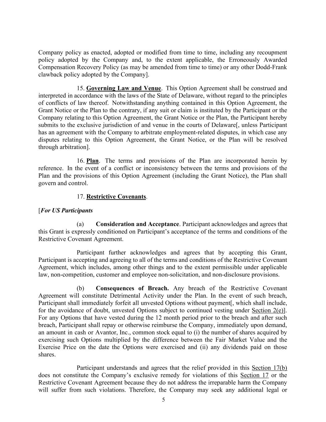 5 Company policy as enacted, adopted or modified from time to time, including any recoupment policy adopted by the Company and, to the extent applicable, the Erroneously Awarded Compensation Recovery Policy (as may be amended from time to time) or any other Dodd-Frank clawback policy adopted by the Company]. 15. Governing Law and Venue. This Option Agreement shall be construed and interpreted in accordance with the laws of the State of Delaware, without regard to the principles of conflicts of law thereof. Notwithstanding anything contained in this Option Agreement, the Grant Notice or the Plan to the contrary, if any suit or claim is instituted by the Participant or the Company relating to this Option Agreement, the Grant Notice or the Plan, the Participant hereby submits to the exclusive jurisdiction of and venue in the courts of Delaware[, unless Participant has an agreement with the Company to arbitrate employment-related disputes, in which case any disputes relating to this Option Agreement, the Grant Notice, or the Plan will be resolved through arbitration]. 16. Plan. The terms and provisions of the Plan are incorporated herein by reference. In the event of a conflict or inconsistency between the terms and provisions of the Plan and the provisions of this Option Agreement (including the Grant Notice), the Plan shall govern and control. 17. Restrictive Covenants. [For US Participants (a) Consideration and Acceptance. Participant acknowledges and agrees that this Grant is expressly conditioned on Participant’s acceptance of the terms and conditions of the Restrictive Covenant Agreement. Participant further acknowledges and agrees that by accepting this Grant, Participant is accepting and agreeing to all of the terms and conditions of the Restrictive Covenant Agreement, which includes, among other things and to the extent permissible under applicable law, non-competition, customer and employee non-solicitation, and non-disclosure provisions. (b) Consequences of Breach. Any breach of the Restrictive Covenant Agreement will constitute Detrimental Activity under the Plan. In the event of such breach, Participant shall immediately forfeit all unvested Options without payment[, which shall include, for the avoidance of doubt, unvested Options subject to continued vesting under Section 2(e)]. For any Options that have vested during the 12 month period prior to the breach and after such breach, Participant shall repay or otherwise reimburse the Company, immediately upon demand, an amount in cash or Avantor, Inc., common stock equal to (i) the number of shares acquired by exercising such Options multiplied by the difference between the Fair Market Value and the Exercise Price on the date the Options were exercised and (ii) any dividends paid on those shares. Participant understands and agrees that the relief provided in this Section 17(b) does not constitute the Company’s exclusive remedy for violations of this Section 17 or the Restrictive Covenant Agreement because they do not address the irreparable harm the Company will suffer from such violations. Therefore, the Company may seek any additional legal or