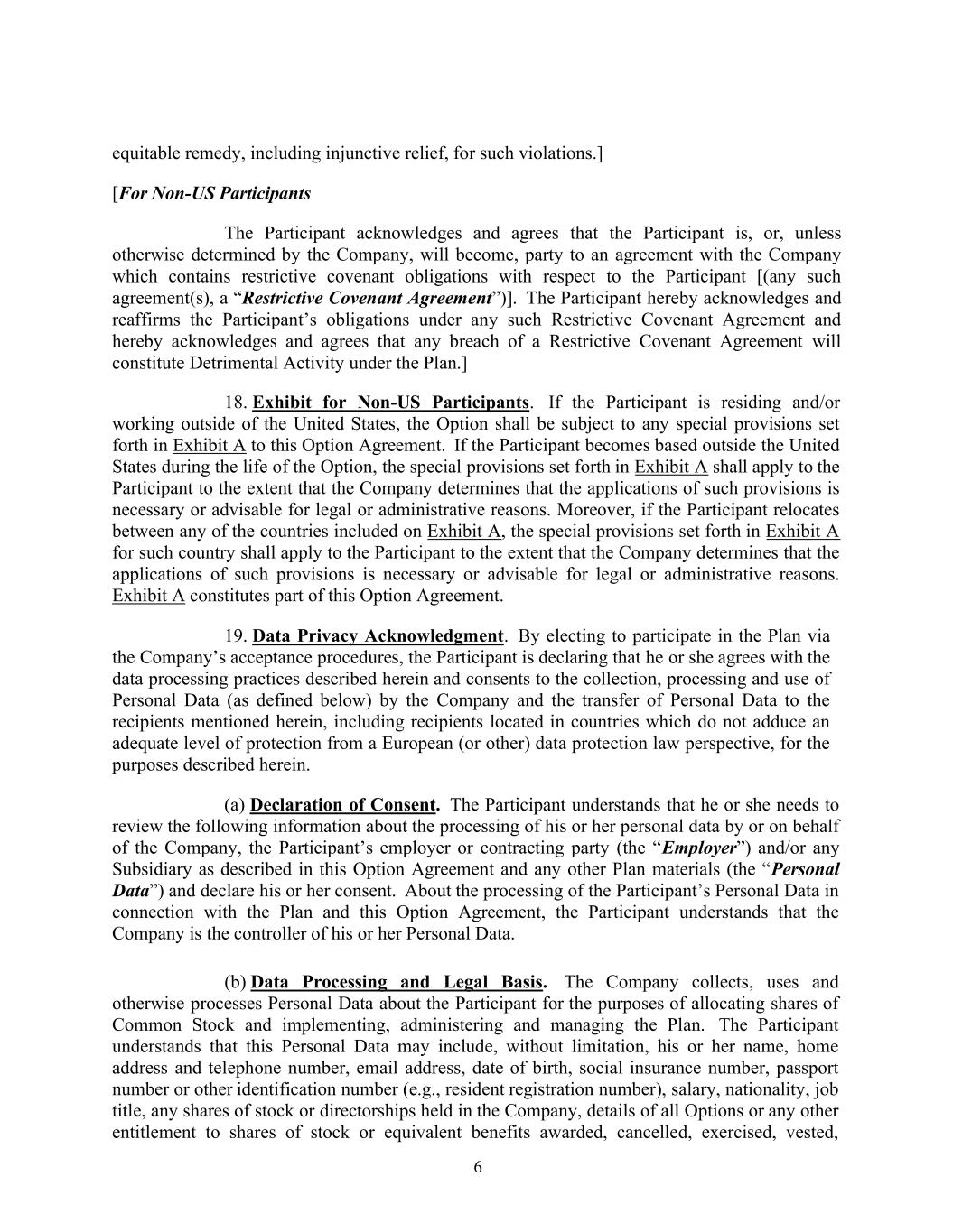 6 equitable remedy, including injunctive relief, for such violations.] [For Non-US Participants The Participant acknowledges and agrees that the Participant is, or, unless otherwise determined by the Company, will become, party to an agreement with the Company which contains restrictive covenant obligations with respect to the Participant [(any such agreement(s), a “Restrictive Covenant Agreement”)]. The Participant hereby acknowledges and reaffirms the Participant’s obligations under any such Restrictive Covenant Agreement and hereby acknowledges and agrees that any breach of a Restrictive Covenant Agreement will constitute Detrimental Activity under the Plan.] 18. Exhibit for Non-US Participants. If the Participant is residing and/or working outside of the United States, the Option shall be subject to any special provisions set forth in Exhibit A to this Option Agreement. If the Participant becomes based outside the United States during the life of the Option, the special provisions set forth in Exhibit A shall apply to the Participant to the extent that the Company determines that the applications of such provisions is necessary or advisable for legal or administrative reasons. Moreover, if the Participant relocates between any of the countries included on Exhibit A, the special provisions set forth in Exhibit A for such country shall apply to the Participant to the extent that the Company determines that the applications of such provisions is necessary or advisable for legal or administrative reasons. Exhibit A constitutes part of this Option Agreement. 19. Data Privacy Acknowledgment. By electing to participate in the Plan via the Company’s acceptance procedures, the Participant is declaring that he or she agrees with the data processing practices described herein and consents to the collection, processing and use of Personal Data (as defined below) by the Company and the transfer of Personal Data to the recipients mentioned herein, including recipients located in countries which do not adduce an adequate level of protection from a European (or other) data protection law perspective, for the purposes described herein. (a) Declaration of Consent. The Participant understands that he or she needs to review the following information about the processing of his or her personal data by or on behalf of the Company, the Participant’s employer or contracting party (the “Employer”) and/or any Subsidiary as described in this Option Agreement and any other Plan materials (the “Personal Data”) and declare his or her consent. About the processing of the Participant’s Personal Data in connection with the Plan and this Option Agreement, the Participant understands that the Company is the controller of his or her Personal Data. (b) Data Processing and Legal Basis. The Company collects, uses and otherwise processes Personal Data about the Participant for the purposes of allocating shares of Common Stock and implementing, administering and managing the Plan. The Participant understands that this Personal Data may include, without limitation, his or her name, home address and telephone number, email address, date of birth, social insurance number, passport number or other identification number (e.g., resident registration number), salary, nationality, job title, any shares of stock or directorships held in the Company, details of all Options or any other entitlement to shares of stock or equivalent benefits awarded, cancelled, exercised, vested,