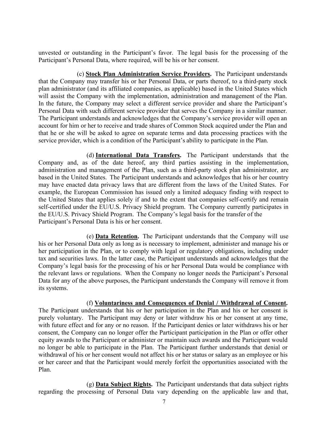 7 unvested or outstanding in the Participant’s favor. The legal basis for the processing of the Participant’s Personal Data, where required, will be his or her consent. (c) Stock Plan Administration Service Providers. The Participant understands that the Company may transfer his or her Personal Data, or parts thereof, to a third-party stock plan administrator (and its affiliated companies, as applicable) based in the United States which will assist the Company with the implementation, administration and management of the Plan. In the future, the Company may select a different service provider and share the Participant’s Personal Data with such different service provider that serves the Company in a similar manner. The Participant understands and acknowledges that the Company’s service provider will open an account for him or her to receive and trade shares of Common Stock acquired under the Plan and that he or she will be asked to agree on separate terms and data processing practices with the service provider, which is a condition of the Participant’s ability to participate in the Plan. (d) International Data Transfers. The Participant understands that the Company and, as of the date hereof, any third parties assisting in the implementation, administration and management of the Plan, such as a third-party stock plan administrator, are based in the United States. The Participant understands and acknowledges that his or her country may have enacted data privacy laws that are different from the laws of the United States. For example, the European Commission has issued only a limited adequacy finding with respect to the United States that applies solely if and to the extent that companies self-certify and remain self-certified under the EU/U.S. Privacy Shield program. The Company currently participates in the EU/U.S. Privacy Shield Program. The Company’s legal basis for the transfer of the Participant’s Personal Data is his or her consent. (e) Data Retention. The Participant understands that the Company will use his or her Personal Data only as long as is necessary to implement, administer and manage his or her participation in the Plan, or to comply with legal or regulatory obligations, including under tax and securities laws. In the latter case, the Participant understands and acknowledges that the Company’s legal basis for the processing of his or her Personal Data would be compliance with the relevant laws or regulations. When the Company no longer needs the Participant’s Personal Data for any of the above purposes, the Participant understands the Company will remove it from its systems. (f) Voluntariness and Consequences of Denial / Withdrawal of Consent. The Participant understands that his or her participation in the Plan and his or her consent is purely voluntary. The Participant may deny or later withdraw his or her consent at any time, with future effect and for any or no reason. If the Participant denies or later withdraws his or her consent, the Company can no longer offer the Participant participation in the Plan or offer other equity awards to the Participant or administer or maintain such awards and the Participant would no longer be able to participate in the Plan. The Participant further understands that denial or withdrawal of his or her consent would not affect his or her status or salary as an employee or his or her career and that the Participant would merely forfeit the opportunities associated with the Plan. (g) Data Subject Rights. The Participant understands that data subject rights regarding the processing of Personal Data vary depending on the applicable law and that,