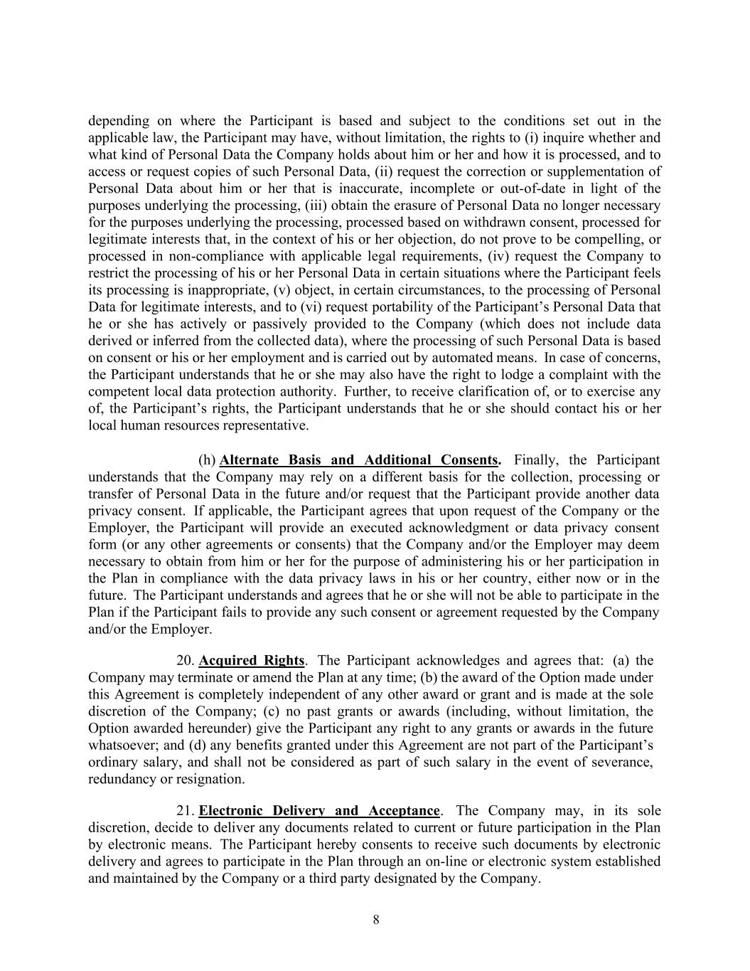 8 depending on where the Participant is based and subject to the conditions set out in the applicable law, the Participant may have, without limitation, the rights to (i) inquire whether and what kind of Personal Data the Company holds about him or her and how it is processed, and to access or request copies of such Personal Data, (ii) request the correction or supplementation of Personal Data about him or her that is inaccurate, incomplete or out-of-date in light of the purposes underlying the processing, (iii) obtain the erasure of Personal Data no longer necessary for the purposes underlying the processing, processed based on withdrawn consent, processed for legitimate interests that, in the context of his or her objection, do not prove to be compelling, or processed in non-compliance with applicable legal requirements, (iv) request the Company to restrict the processing of his or her Personal Data in certain situations where the Participant feels its processing is inappropriate, (v) object, in certain circumstances, to the processing of Personal Data for legitimate interests, and to (vi) request portability of the Participant’s Personal Data that he or she has actively or passively provided to the Company (which does not include data derived or inferred from the collected data), where the processing of such Personal Data is based on consent or his or her employment and is carried out by automated means. In case of concerns, the Participant understands that he or she may also have the right to lodge a complaint with the competent local data protection authority. Further, to receive clarification of, or to exercise any of, the Participant’s rights, the Participant understands that he or she should contact his or her local human resources representative. (h) Alternate Basis and Additional Consents. Finally, the Participant understands that the Company may rely on a different basis for the collection, processing or transfer of Personal Data in the future and/or request that the Participant provide another data privacy consent. If applicable, the Participant agrees that upon request of the Company or the Employer, the Participant will provide an executed acknowledgment or data privacy consent form (or any other agreements or consents) that the Company and/or the Employer may deem necessary to obtain from him or her for the purpose of administering his or her participation in the Plan in compliance with the data privacy laws in his or her country, either now or in the future. The Participant understands and agrees that he or she will not be able to participate in the Plan if the Participant fails to provide any such consent or agreement requested by the Company and/or the Employer. 20. Acquired Rights. The Participant acknowledges and agrees that: (a) the Company may terminate or amend the Plan at any time; (b) the award of the Option made under this Agreement is completely independent of any other award or grant and is made at the sole discretion of the Company; (c) no past grants or awards (including, without limitation, the Option awarded hereunder) give the Participant any right to any grants or awards in the future whatsoever; and (d) any benefits granted under this Agreement are not part of the Participant’s ordinary salary, and shall not be considered as part of such salary in the event of severance, redundancy or resignation. 21. Electronic Delivery and Acceptance. The Company may, in its sole discretion, decide to deliver any documents related to current or future participation in the Plan by electronic means. The Participant hereby consents to receive such documents by electronic delivery and agrees to participate in the Plan through an on-line or electronic system established and maintained by the Company or a third party designated by the Company.