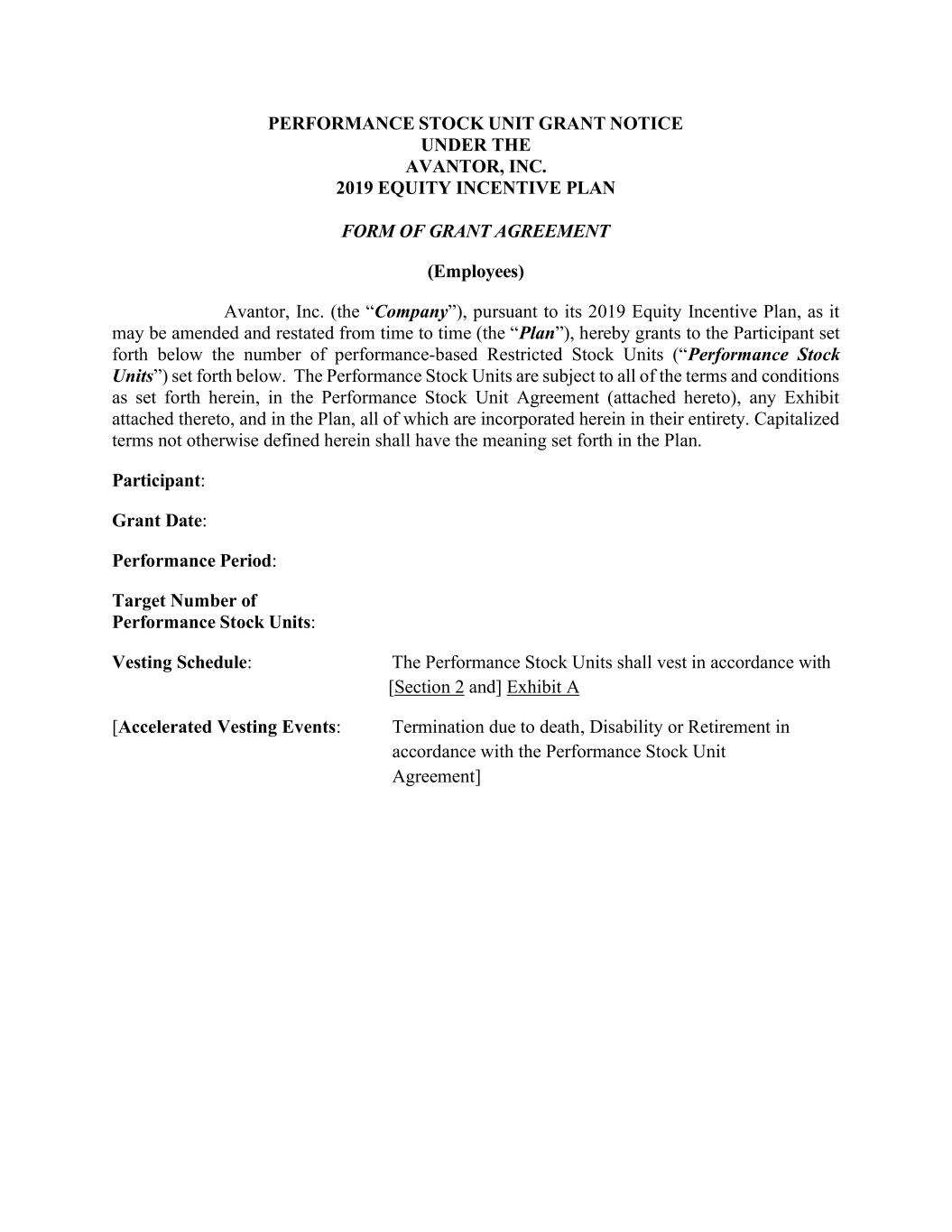 PERFORMANCE STOCK UNIT GRANT NOTICE UNDER THE AVANTOR, INC. 2019 EQUITY INCENTIVE PLAN FORM OF GRANT AGREEMENT (Employees) Avantor, Inc. (the “Company”), pursuant to its 2019 Equity Incentive Plan, as it may be amended and restated from time to time (the “Plan”), hereby grants to the Participant set forth below the number of performance-based Restricted Stock Units (“Performance Stock Units”) set forth below. The Performance Stock Units are subject to all of the terms and conditions as set forth herein, in the Performance Stock Unit Agreement (attached hereto), any Exhibit attached thereto, and in the Plan, all of which are incorporated herein in their entirety. Capitalized terms not otherwise defined herein shall have the meaning set forth in the Plan. Participant: Grant Date: Performance Period: Target Number of Performance Stock Units: Vesting Schedule: The Performance Stock Units shall vest in accordance with [Section 2 and] Exhibit A [Accelerated Vesting Events: Termination due to death, Disability or Retirement in accordance with the Performance Stock Unit Agreement]