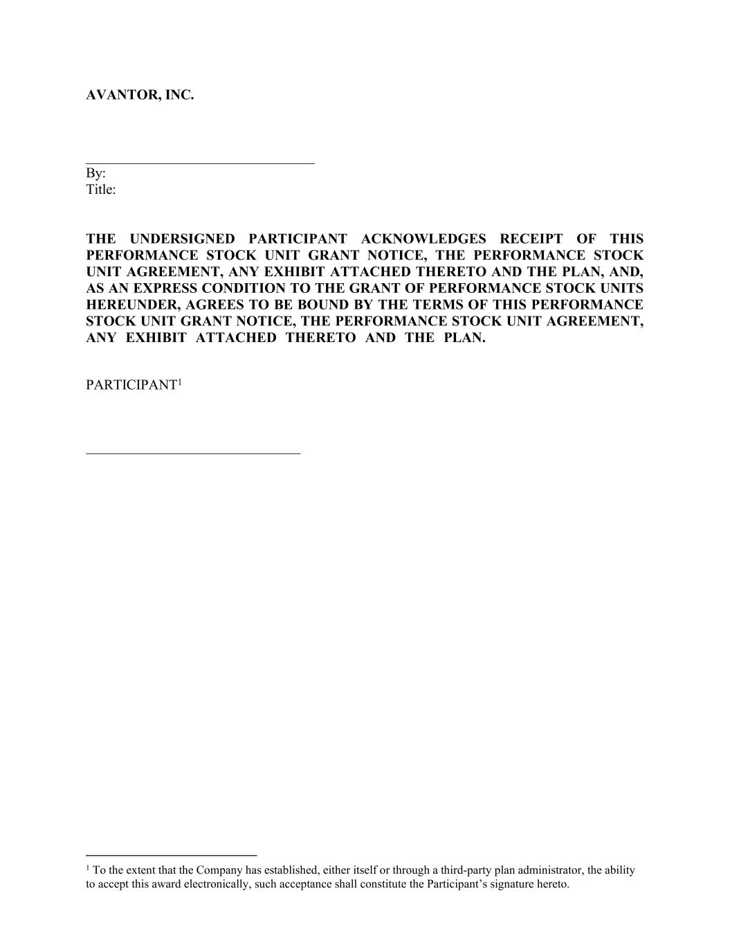 AVANTOR, INC. By: Title: THE UNDERSIGNED PARTICIPANT ACKNOWLEDGES RECEIPT OF THIS PERFORMANCE STOCK UNIT GRANT NOTICE, THE PERFORMANCE STOCK UNIT AGREEMENT, ANY EXHIBIT ATTACHED THERETO AND THE PLAN, AND, AS AN EXPRESS CONDITION TO THE GRANT OF PERFORMANCE STOCK UNITS HEREUNDER, AGREES TO BE BOUND BY THE TERMS OF THIS PERFORMANCE STOCK UNIT GRANT NOTICE, THE PERFORMANCE STOCK UNIT AGREEMENT, ANY EXHIBIT ATTACHED THERETO AND THE PLAN. PARTICIPANT1 1 To the extent that the Company has established, either itself or through a third-party plan administrator, the ability to accept this award electronically, such acceptance shall constitute the Participant’s signature hereto.