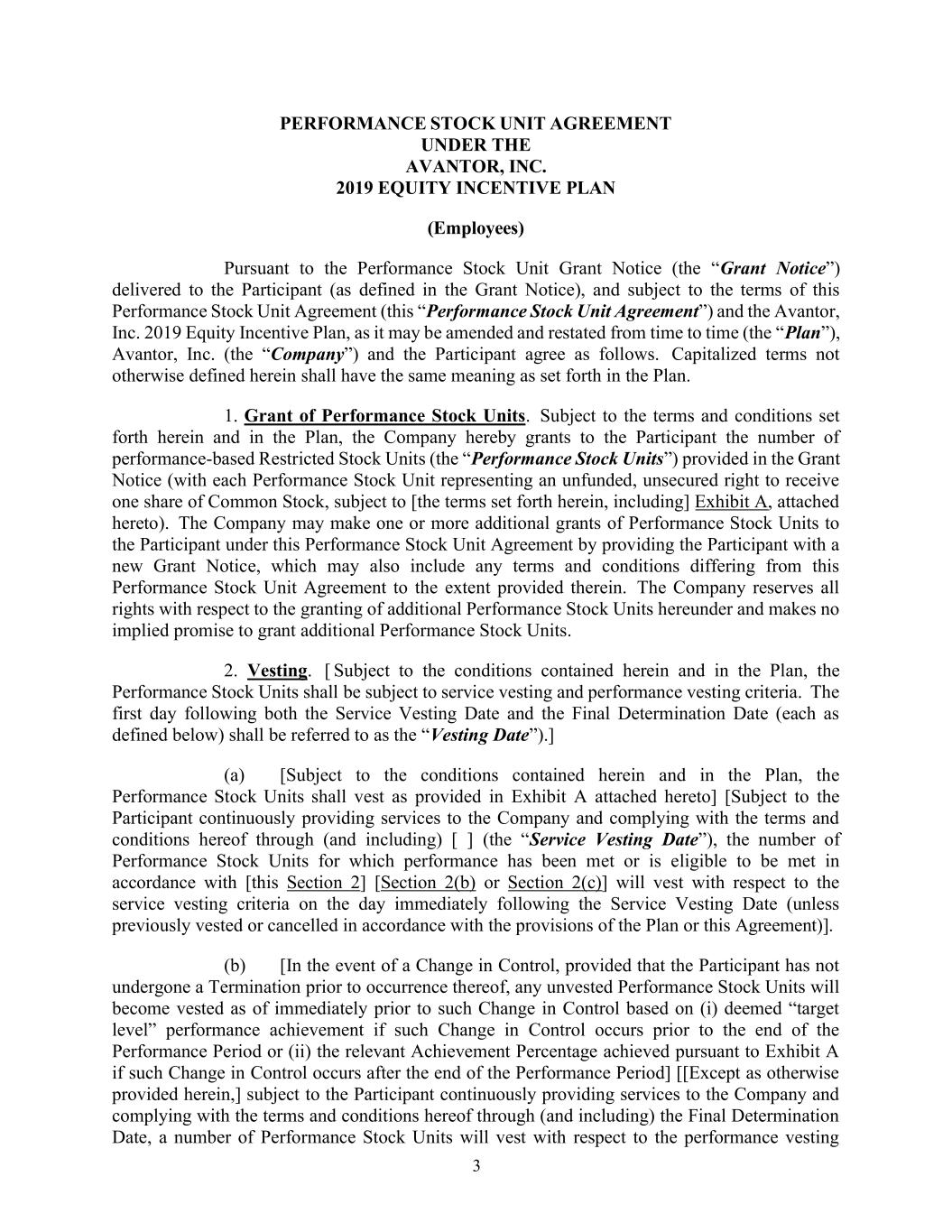 3 PERFORMANCE STOCK UNIT AGREEMENT UNDER THE AVANTOR, INC. 2019 EQUITY INCENTIVE PLAN (Employees) Pursuant to the Performance Stock Unit Grant Notice (the “Grant Notice”) delivered to the Participant (as defined in the Grant Notice), and subject to the terms of this Performance Stock Unit Agreement (this “Performance Stock Unit Agreement”) and the Avantor, Inc. 2019 Equity Incentive Plan, as it may be amended and restated from time to time (the “Plan”), Avantor, Inc. (the “Company”) and the Participant agree as follows. Capitalized terms not otherwise defined herein shall have the same meaning as set forth in the Plan. 1. Grant of Performance Stock Units. Subject to the terms and conditions set forth herein and in the Plan, the Company hereby grants to the Participant the number of performance-based Restricted Stock Units (the “Performance Stock Units”) provided in the Grant Notice (with each Performance Stock Unit representing an unfunded, unsecured right to receive one share of Common Stock, subject to [the terms set forth herein, including] Exhibit A, attached hereto). The Company may make one or more additional grants of Performance Stock Units to the Participant under this Performance Stock Unit Agreement by providing the Participant with a new Grant Notice, which may also include any terms and conditions differing from this Performance Stock Unit Agreement to the extent provided therein. The Company reserves all rights with respect to the granting of additional Performance Stock Units hereunder and makes no implied promise to grant additional Performance Stock Units. 2. Vesting. [ Subject to the conditions contained herein and in the Plan, the Performance Stock Units shall be subject to service vesting and performance vesting criteria. The first day following both the Service Vesting Date and the Final Determination Date (each as defined below) shall be referred to as the “Vesting Date”).] (a) [Subject to the conditions contained herein and in the Plan, the Performance Stock Units shall vest as provided in Exhibit A attached hereto] [Subject to the Participant continuously providing services to the Company and complying with the terms and conditions hereof through (and including) [ ] (the “Service Vesting Date”), the number of Performance Stock Units for which performance has been met or is eligible to be met in accordance with [this Section 2] [Section 2(b) or Section 2(c)] will vest with respect to the service vesting criteria on the day immediately following the Service Vesting Date (unless previously vested or cancelled in accordance with the provisions of the Plan or this Agreement)]. (b) [In the event of a Change in Control, provided that the Participant has not undergone a Termination prior to occurrence thereof, any unvested Performance Stock Units will become vested as of immediately prior to such Change in Control based on (i) deemed “target level” performance achievement if such Change in Control occurs prior to the end of the Performance Period or (ii) the relevant Achievement Percentage achieved pursuant to Exhibit A if such Change in Control occurs after the end of the Performance Period] [[Except as otherwise provided herein,] subject to the Participant continuously providing services to the Company and complying with the terms and conditions hereof through (and including) the Final Determination Date, a number of Performance Stock Units will vest with respect to the performance vesting