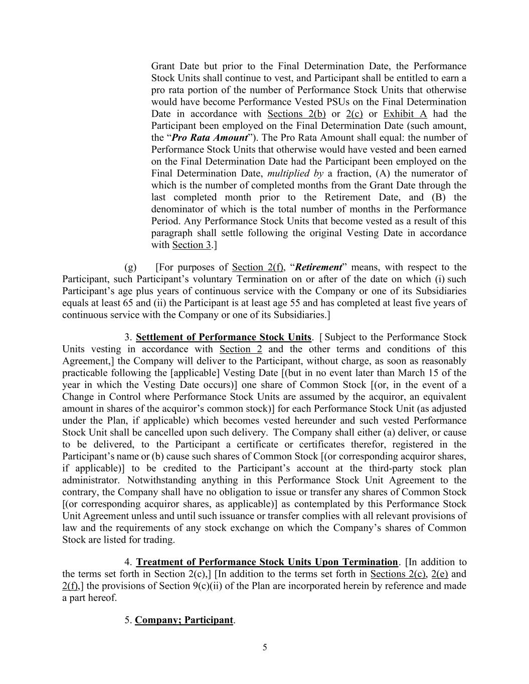 5 Grant Date but prior to the Final Determination Date, the Performance Stock Units shall continue to vest, and Participant shall be entitled to earn a pro rata portion of the number of Performance Stock Units that otherwise would have become Performance Vested PSUs on the Final Determination Date in accordance with Sections 2(b) or 2(c) or Exhibit A had the Participant been employed on the Final Determination Date (such amount, the “Pro Rata Amount”). The Pro Rata Amount shall equal: the number of Performance Stock Units that otherwise would have vested and been earned on the Final Determination Date had the Participant been employed on the Final Determination Date, multiplied by a fraction, (A) the numerator of which is the number of completed months from the Grant Date through the last completed month prior to the Retirement Date, and (B) the denominator of which is the total number of months in the Performance Period. Any Performance Stock Units that become vested as a result of this paragraph shall settle following the original Vesting Date in accordance with Section 3.] (g) [For purposes of Section 2(f), “Retirement” means, with respect to the Participant, such Participant’s voluntary Termination on or after of the date on which (i) such Participant’s age plus years of continuous service with the Company or one of its Subsidiaries equals at least 65 and (ii) the Participant is at least age 55 and has completed at least five years of continuous service with the Company or one of its Subsidiaries.] 3. Settlement of Performance Stock Units. [ Subject to the Performance Stock Units vesting in accordance with Section 2 and the other terms and conditions of this Agreement,] the Company will deliver to the Participant, without charge, as soon as reasonably practicable following the [applicable] Vesting Date [(but in no event later than March 15 of the year in which the Vesting Date occurs)] one share of Common Stock [(or, in the event of a Change in Control where Performance Stock Units are assumed by the acquiror, an equivalent amount in shares of the acquiror’s common stock)] for each Performance Stock Unit (as adjusted under the Plan, if applicable) which becomes vested hereunder and such vested Performance Stock Unit shall be cancelled upon such delivery. The Company shall either (a) deliver, or cause to be delivered, to the Participant a certificate or certificates therefor, registered in the Participant’s name or (b) cause such shares of Common Stock [(or corresponding acquiror shares, if applicable)] to be credited to the Participant’s account at the third-party stock plan administrator. Notwithstanding anything in this Performance Stock Unit Agreement to the contrary, the Company shall have no obligation to issue or transfer any shares of Common Stock [(or corresponding acquiror shares, as applicable)] as contemplated by this Performance Stock Unit Agreement unless and until such issuance or transfer complies with all relevant provisions of law and the requirements of any stock exchange on which the Company’s shares of Common Stock are listed for trading. 4. Treatment of Performance Stock Units Upon Termination. [In addition to the terms set forth in Section 2(c),] [In addition to the terms set forth in Sections 2(c), 2(e) and 2(f),] the provisions of Section 9(c)(ii) of the Plan are incorporated herein by reference and made a part hereof. 5. Company; Participant.