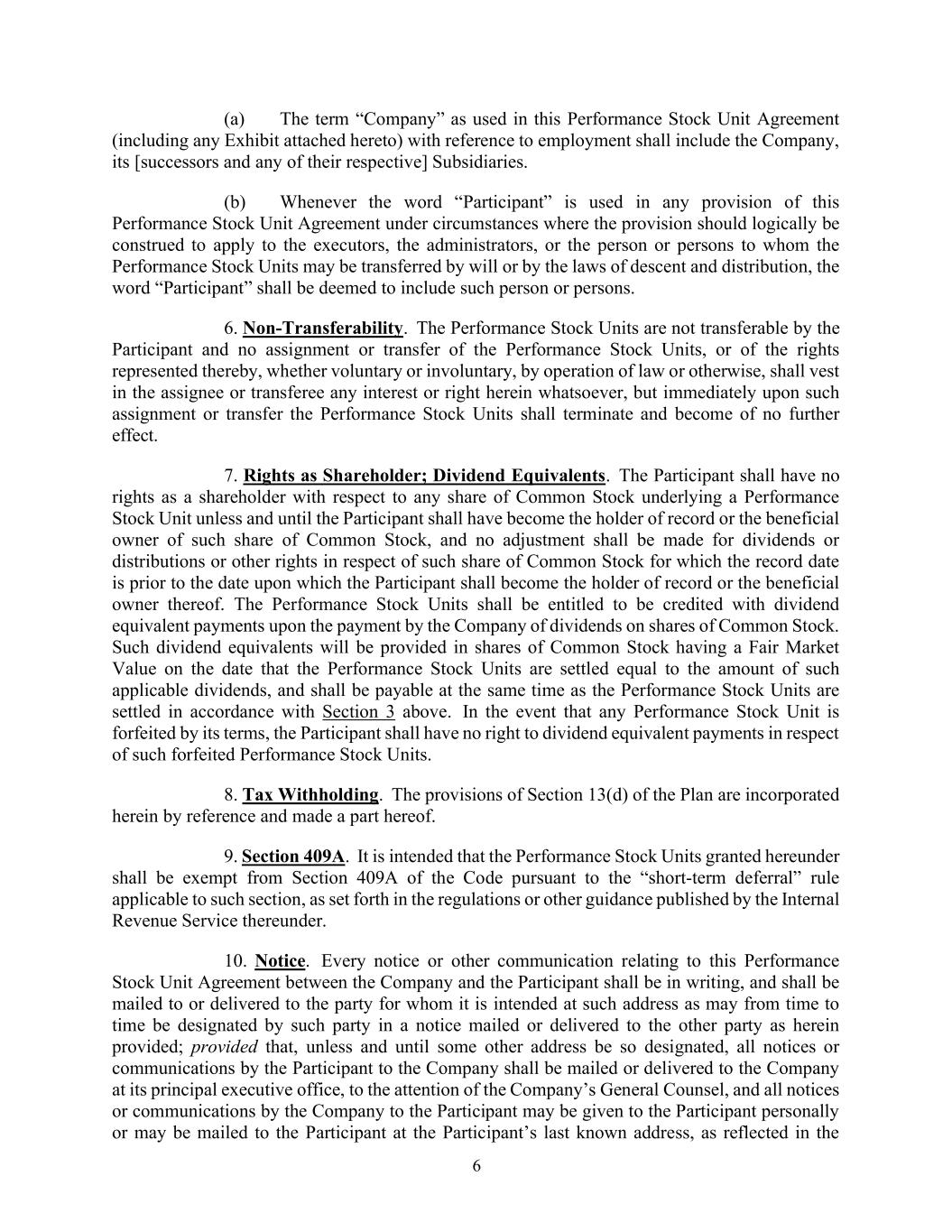 6 (a) The term “Company” as used in this Performance Stock Unit Agreement (including any Exhibit attached hereto) with reference to employment shall include the Company, its [successors and any of their respective] Subsidiaries. (b) Whenever the word “Participant” is used in any provision of this Performance Stock Unit Agreement under circumstances where the provision should logically be construed to apply to the executors, the administrators, or the person or persons to whom the Performance Stock Units may be transferred by will or by the laws of descent and distribution, the word “Participant” shall be deemed to include such person or persons. 6. Non-Transferability. The Performance Stock Units are not transferable by the Participant and no assignment or transfer of the Performance Stock Units, or of the rights represented thereby, whether voluntary or involuntary, by operation of law or otherwise, shall vest in the assignee or transferee any interest or right herein whatsoever, but immediately upon such assignment or transfer the Performance Stock Units shall terminate and become of no further effect. 7. Rights as Shareholder; Dividend Equivalents. The Participant shall have no rights as a shareholder with respect to any share of Common Stock underlying a Performance Stock Unit unless and until the Participant shall have become the holder of record or the beneficial owner of such share of Common Stock, and no adjustment shall be made for dividends or distributions or other rights in respect of such share of Common Stock for which the record date is prior to the date upon which the Participant shall become the holder of record or the beneficial owner thereof. The Performance Stock Units shall be entitled to be credited with dividend equivalent payments upon the payment by the Company of dividends on shares of Common Stock. Such dividend equivalents will be provided in shares of Common Stock having a Fair Market Value on the date that the Performance Stock Units are settled equal to the amount of such applicable dividends, and shall be payable at the same time as the Performance Stock Units are settled in accordance with Section 3 above. In the event that any Performance Stock Unit is forfeited by its terms, the Participant shall have no right to dividend equivalent payments in respect of such forfeited Performance Stock Units. 8. Tax Withholding. The provisions of Section 13(d) of the Plan are incorporated herein by reference and made a part hereof. 9. Section 409A. It is intended that the Performance Stock Units granted hereunder shall be exempt from Section 409A of the Code pursuant to the “short-term deferral” rule applicable to such section, as set forth in the regulations or other guidance published by the Internal Revenue Service thereunder. 10. Notice. Every notice or other communication relating to this Performance Stock Unit Agreement between the Company and the Participant shall be in writing, and shall be mailed to or delivered to the party for whom it is intended at such address as may from time to time be designated by such party in a notice mailed or delivered to the other party as herein provided; provided that, unless and until some other address be so designated, all notices or communications by the Participant to the Company shall be mailed or delivered to the Company at its principal executive office, to the attention of the Company’s General Counsel, and all notices or communications by the Company to the Participant may be given to the Participant personally or may be mailed to the Participant at the Participant’s last known address, as reflected in the