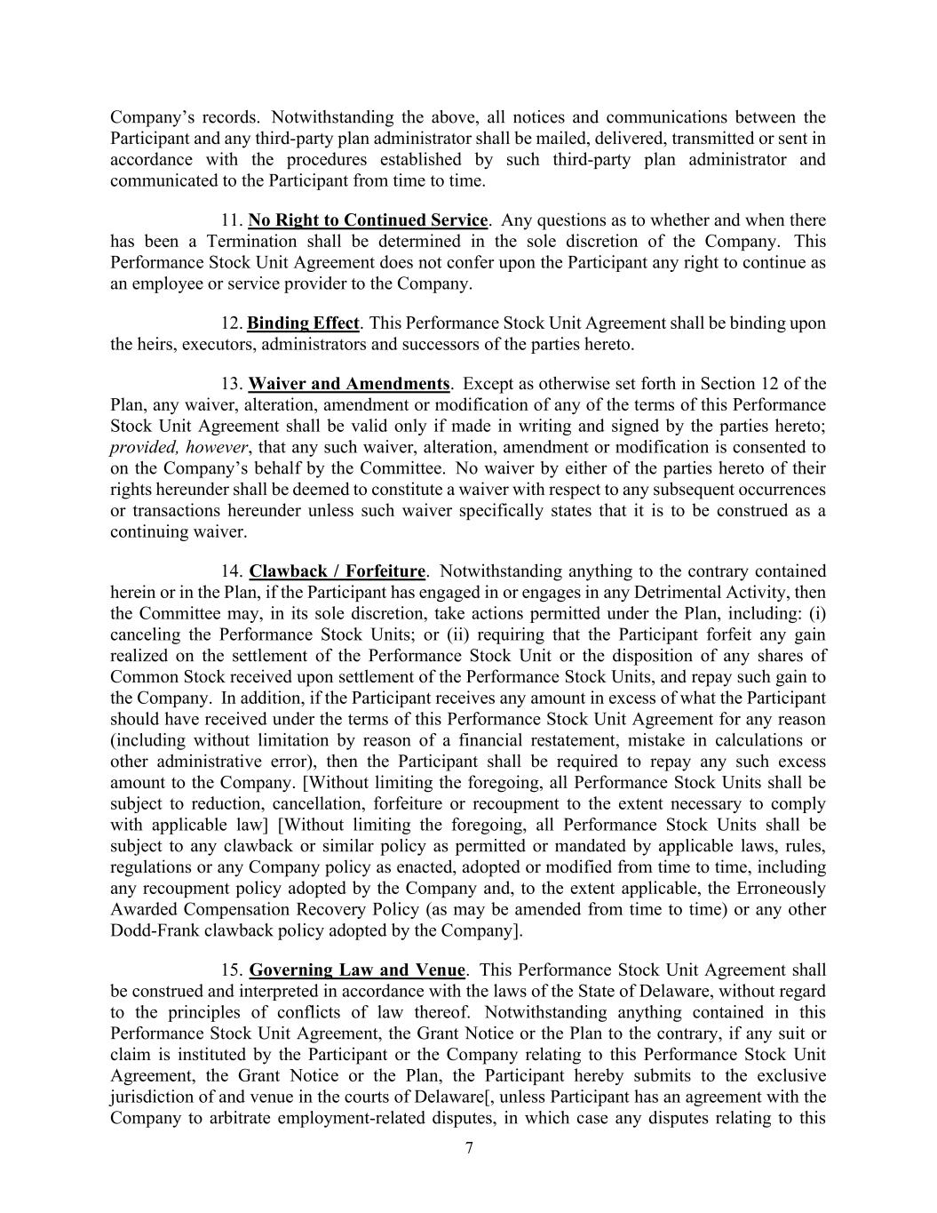 7 Company’s records. Notwithstanding the above, all notices and communications between the Participant and any third-party plan administrator shall be mailed, delivered, transmitted or sent in accordance with the procedures established by such third-party plan administrator and communicated to the Participant from time to time. 11. No Right to Continued Service. Any questions as to whether and when there has been a Termination shall be determined in the sole discretion of the Company. This Performance Stock Unit Agreement does not confer upon the Participant any right to continue as an employee or service provider to the Company. 12. Binding Effect. This Performance Stock Unit Agreement shall be binding upon the heirs, executors, administrators and successors of the parties hereto. 13. Waiver and Amendments. Except as otherwise set forth in Section 12 of the Plan, any waiver, alteration, amendment or modification of any of the terms of this Performance Stock Unit Agreement shall be valid only if made in writing and signed by the parties hereto; provided, however, that any such waiver, alteration, amendment or modification is consented to on the Company’s behalf by the Committee. No waiver by either of the parties hereto of their rights hereunder shall be deemed to constitute a waiver with respect to any subsequent occurrences or transactions hereunder unless such waiver specifically states that it is to be construed as a continuing waiver. 14. Clawback / Forfeiture. Notwithstanding anything to the contrary contained herein or in the Plan, if the Participant has engaged in or engages in any Detrimental Activity, then the Committee may, in its sole discretion, take actions permitted under the Plan, including: (i) canceling the Performance Stock Units; or (ii) requiring that the Participant forfeit any gain realized on the settlement of the Performance Stock Unit or the disposition of any shares of Common Stock received upon settlement of the Performance Stock Units, and repay such gain to the Company. In addition, if the Participant receives any amount in excess of what the Participant should have received under the terms of this Performance Stock Unit Agreement for any reason (including without limitation by reason of a financial restatement, mistake in calculations or other administrative error), then the Participant shall be required to repay any such excess amount to the Company. [Without limiting the foregoing, all Performance Stock Units shall be subject to reduction, cancellation, forfeiture or recoupment to the extent necessary to comply with applicable law] [Without limiting the foregoing, all Performance Stock Units shall be subject to any clawback or similar policy as permitted or mandated by applicable laws, rules, regulations or any Company policy as enacted, adopted or modified from time to time, including any recoupment policy adopted by the Company and, to the extent applicable, the Erroneously Awarded Compensation Recovery Policy (as may be amended from time to time) or any other Dodd-Frank clawback policy adopted by the Company]. 15. Governing Law and Venue. This Performance Stock Unit Agreement shall be construed and interpreted in accordance with the laws of the State of Delaware, without regard to the principles of conflicts of law thereof. Notwithstanding anything contained in this Performance Stock Unit Agreement, the Grant Notice or the Plan to the contrary, if any suit or claim is instituted by the Participant or the Company relating to this Performance Stock Unit Agreement, the Grant Notice or the Plan, the Participant hereby submits to the exclusive jurisdiction of and venue in the courts of Delaware[, unless Participant has an agreement with the Company to arbitrate employment-related disputes, in which case any disputes relating to this