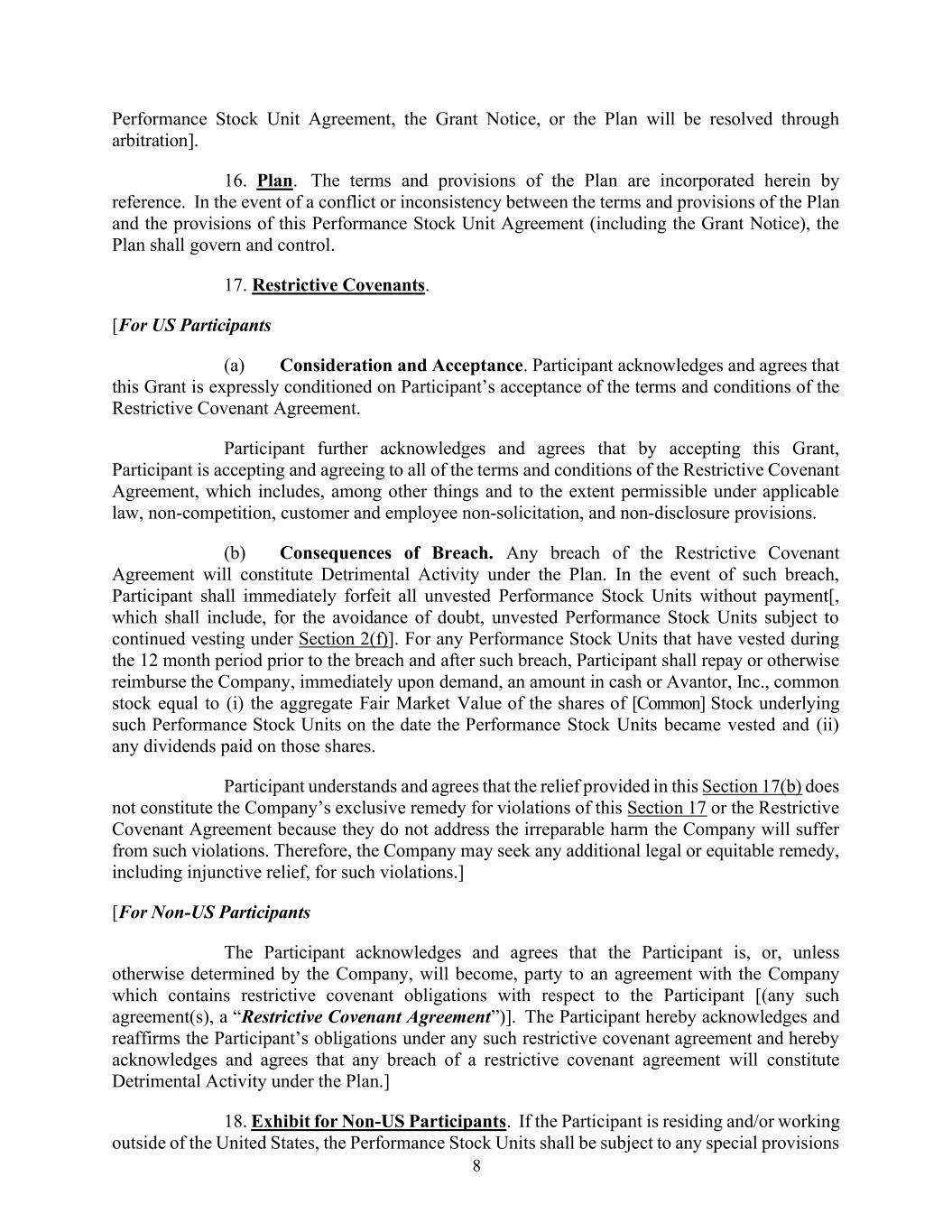 8 Performance Stock Unit Agreement, the Grant Notice, or the Plan will be resolved through arbitration]. 16. Plan. The terms and provisions of the Plan are incorporated herein by reference. In the event of a conflict or inconsistency between the terms and provisions of the Plan and the provisions of this Performance Stock Unit Agreement (including the Grant Notice), the Plan shall govern and control. 17. Restrictive Covenants. [For US Participants (a) Consideration and Acceptance. Participant acknowledges and agrees that this Grant is expressly conditioned on Participant’s acceptance of the terms and conditions of the Restrictive Covenant Agreement. Participant further acknowledges and agrees that by accepting this Grant, Participant is accepting and agreeing to all of the terms and conditions of the Restrictive Covenant Agreement, which includes, among other things and to the extent permissible under applicable law, non-competition, customer and employee non-solicitation, and non-disclosure provisions. (b) Consequences of Breach. Any breach of the Restrictive Covenant Agreement will constitute Detrimental Activity under the Plan. In the event of such breach, Participant shall immediately forfeit all unvested Performance Stock Units without payment[, which shall include, for the avoidance of doubt, unvested Performance Stock Units subject to continued vesting under Section 2(f)]. For any Performance Stock Units that have vested during the 12 month period prior to the breach and after such breach, Participant shall repay or otherwise reimburse the Company, immediately upon demand, an amount in cash or Avantor, Inc., common stock equal to (i) the aggregate Fair Market Value of the shares of [Common] Stock underlying such Performance Stock Units on the date the Performance Stock Units became vested and (ii) any dividends paid on those shares. Participant understands and agrees that the relief provided in this Section 17(b) does not constitute the Company’s exclusive remedy for violations of this Section 17 or the Restrictive Covenant Agreement because they do not address the irreparable harm the Company will suffer from such violations. Therefore, the Company may seek any additional legal or equitable remedy, including injunctive relief, for such violations.] [For Non-US Participants The Participant acknowledges and agrees that the Participant is, or, unless otherwise determined by the Company, will become, party to an agreement with the Company which contains restrictive covenant obligations with respect to the Participant [(any such agreement(s), a “Restrictive Covenant Agreement”)]. The Participant hereby acknowledges and reaffirms the Participant’s obligations under any such restrictive covenant agreement and hereby acknowledges and agrees that any breach of a restrictive covenant agreement will constitute Detrimental Activity under the Plan.] 18. Exhibit for Non-US Participants. If the Participant is residing and/or working outside of the United States, the Performance Stock Units shall be subject to any special provisions