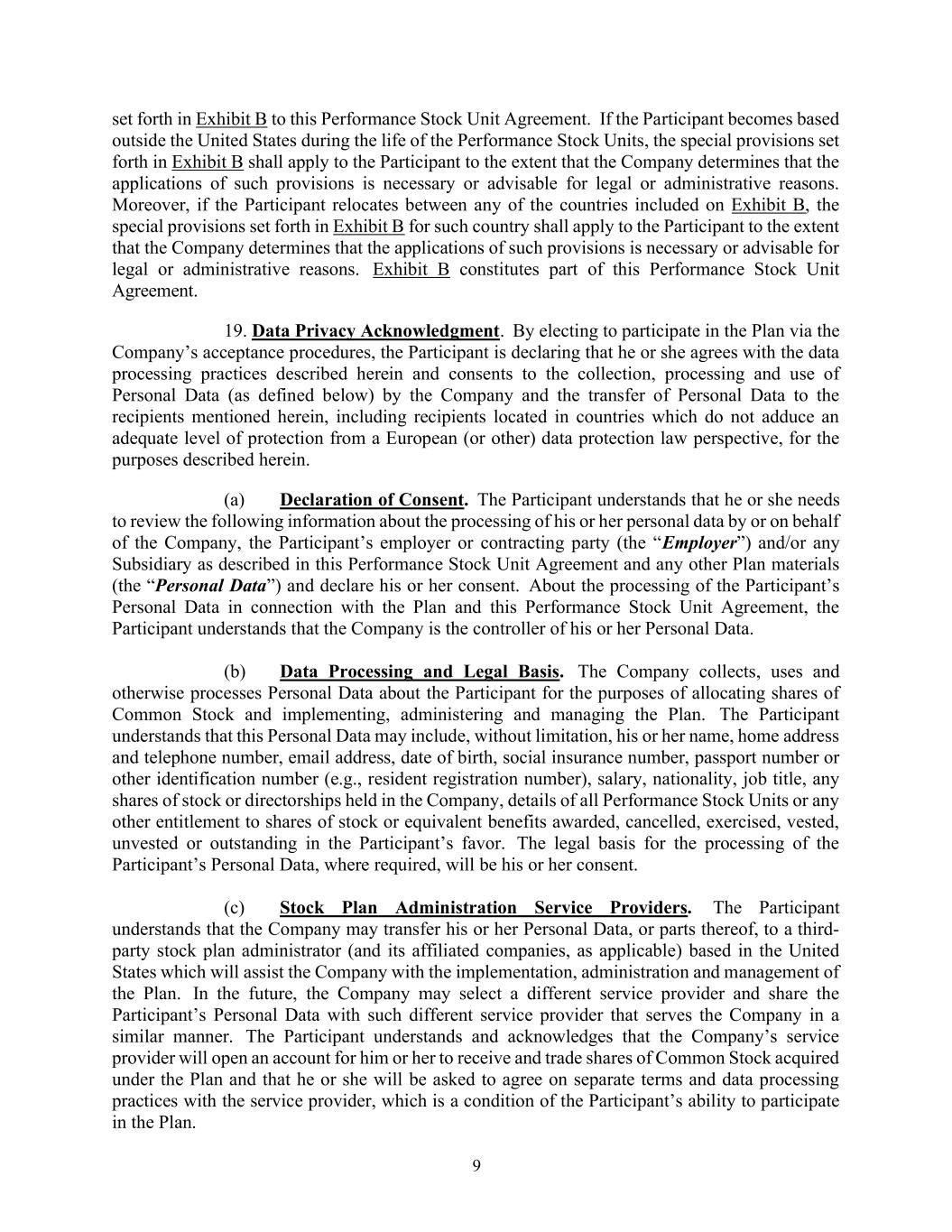 9 set forth in Exhibit B to this Performance Stock Unit Agreement. If the Participant becomes based outside the United States during the life of the Performance Stock Units, the special provisions set forth in Exhibit B shall apply to the Participant to the extent that the Company determines that the applications of such provisions is necessary or advisable for legal or administrative reasons. Moreover, if the Participant relocates between any of the countries included on Exhibit B, the special provisions set forth in Exhibit B for such country shall apply to the Participant to the extent that the Company determines that the applications of such provisions is necessary or advisable for legal or administrative reasons. Exhibit B constitutes part of this Performance Stock Unit Agreement. 19. Data Privacy Acknowledgment. By electing to participate in the Plan via the Company’s acceptance procedures, the Participant is declaring that he or she agrees with the data processing practices described herein and consents to the collection, processing and use of Personal Data (as defined below) by the Company and the transfer of Personal Data to the recipients mentioned herein, including recipients located in countries which do not adduce an adequate level of protection from a European (or other) data protection law perspective, for the purposes described herein. (a) Declaration of Consent. The Participant understands that he or she needs to review the following information about the processing of his or her personal data by or on behalf of the Company, the Participant’s employer or contracting party (the “Employer”) and/or any Subsidiary as described in this Performance Stock Unit Agreement and any other Plan materials (the “Personal Data”) and declare his or her consent. About the processing of the Participant’s Personal Data in connection with the Plan and this Performance Stock Unit Agreement, the Participant understands that the Company is the controller of his or her Personal Data. (b) Data Processing and Legal Basis. The Company collects, uses and otherwise processes Personal Data about the Participant for the purposes of allocating shares of Common Stock and implementing, administering and managing the Plan. The Participant understands that this Personal Data may include, without limitation, his or her name, home address and telephone number, email address, date of birth, social insurance number, passport number or other identification number (e.g., resident registration number), salary, nationality, job title, any shares of stock or directorships held in the Company, details of all Performance Stock Units or any other entitlement to shares of stock or equivalent benefits awarded, cancelled, exercised, vested, unvested or outstanding in the Participant’s favor. The legal basis for the processing of the Participant’s Personal Data, where required, will be his or her consent. (c) Stock Plan Administration Service Providers. The Participant understands that the Company may transfer his or her Personal Data, or parts thereof, to a third- party stock plan administrator (and its affiliated companies, as applicable) based in the United States which will assist the Company with the implementation, administration and management of the Plan. In the future, the Company may select a different service provider and share the Participant’s Personal Data with such different service provider that serves the Company in a similar manner. The Participant understands and acknowledges that the Company’s service provider will open an account for him or her to receive and trade shares of Common Stock acquired under the Plan and that he or she will be asked to agree on separate terms and data processing practices with the service provider, which is a condition of the Participant’s ability to participate in the Plan.
