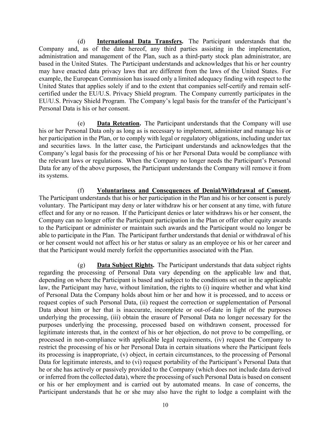 10 (d) International Data Transfers. The Participant understands that the Company and, as of the date hereof, any third parties assisting in the implementation, administration and management of the Plan, such as a third-party stock plan administrator, are based in the United States. The Participant understands and acknowledges that his or her country may have enacted data privacy laws that are different from the laws of the United States. For example, the European Commission has issued only a limited adequacy finding with respect to the United States that applies solely if and to the extent that companies self-certify and remain self- certified under the EU/U.S. Privacy Shield program. The Company currently participates in the EU/U.S. Privacy Shield Program. The Company’s legal basis for the transfer of the Participant’s Personal Data is his or her consent. (e) Data Retention. The Participant understands that the Company will use his or her Personal Data only as long as is necessary to implement, administer and manage his or her participation in the Plan, or to comply with legal or regulatory obligations, including under tax and securities laws. In the latter case, the Participant understands and acknowledges that the Company’s legal basis for the processing of his or her Personal Data would be compliance with the relevant laws or regulations. When the Company no longer needs the Participant’s Personal Data for any of the above purposes, the Participant understands the Company will remove it from its systems. (f) Voluntariness and Consequences of Denial/Withdrawal of Consent. The Participant understands that his or her participation in the Plan and his or her consent is purely voluntary. The Participant may deny or later withdraw his or her consent at any time, with future effect and for any or no reason. If the Participant denies or later withdraws his or her consent, the Company can no longer offer the Participant participation in the Plan or offer other equity awards to the Participant or administer or maintain such awards and the Participant would no longer be able to participate in the Plan. The Participant further understands that denial or withdrawal of his or her consent would not affect his or her status or salary as an employee or his or her career and that the Participant would merely forfeit the opportunities associated with the Plan. (g) Data Subject Rights. The Participant understands that data subject rights regarding the processing of Personal Data vary depending on the applicable law and that, depending on where the Participant is based and subject to the conditions set out in the applicable law, the Participant may have, without limitation, the rights to (i) inquire whether and what kind of Personal Data the Company holds about him or her and how it is processed, and to access or request copies of such Personal Data, (ii) request the correction or supplementation of Personal Data about him or her that is inaccurate, incomplete or out-of-date in light of the purposes underlying the processing, (iii) obtain the erasure of Personal Data no longer necessary for the purposes underlying the processing, processed based on withdrawn consent, processed for legitimate interests that, in the context of his or her objection, do not prove to be compelling, or processed in non-compliance with applicable legal requirements, (iv) request the Company to restrict the processing of his or her Personal Data in certain situations where the Participant feels its processing is inappropriate, (v) object, in certain circumstances, to the processing of Personal Data for legitimate interests, and to (vi) request portability of the Participant’s Personal Data that he or she has actively or passively provided to the Company (which does not include data derived or inferred from the collected data), where the processing of such Personal Data is based on consent or his or her employment and is carried out by automated means. In case of concerns, the Participant understands that he or she may also have the right to lodge a complaint with the