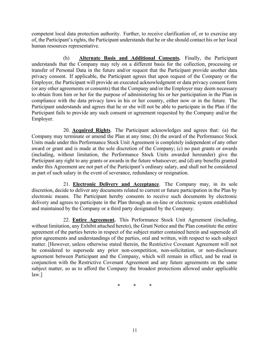 11 competent local data protection authority. Further, to receive clarification of, or to exercise any of, the Participant’s rights, the Participant understands that he or she should contact his or her local human resources representative. (h) Alternate Basis and Additional Consents. Finally, the Participant understands that the Company may rely on a different basis for the collection, processing or transfer of Personal Data in the future and/or request that the Participant provide another data privacy consent. If applicable, the Participant agrees that upon request of the Company or the Employer, the Participant will provide an executed acknowledgment or data privacy consent form (or any other agreements or consents) that the Company and/or the Employer may deem necessary to obtain from him or her for the purpose of administering his or her participation in the Plan in compliance with the data privacy laws in his or her country, either now or in the future. The Participant understands and agrees that he or she will not be able to participate in the Plan if the Participant fails to provide any such consent or agreement requested by the Company and/or the Employer. 20. Acquired Rights. The Participant acknowledges and agrees that: (a) the Company may terminate or amend the Plan at any time; (b) the award of the Performance Stock Units made under this Performance Stock Unit Agreement is completely independent of any other award or grant and is made at the sole discretion of the Company; (c) no past grants or awards (including, without limitation, the Performance Stock Units awarded hereunder) give the Participant any right to any grants or awards in the future whatsoever; and (d) any benefits granted under this Agreement are not part of the Participant’s ordinary salary, and shall not be considered as part of such salary in the event of severance, redundancy or resignation. 21. Electronic Delivery and Acceptance. The Company may, in its sole discretion, decide to deliver any documents related to current or future participation in the Plan by electronic means. The Participant hereby consents to receive such documents by electronic delivery and agrees to participate in the Plan through an on-line or electronic system established and maintained by the Company or a third party designated by the Company. 22. Entire Agreement. This Performance Stock Unit Agreement (including, without limitation, any Exhibit attached hereto), the Grant Notice and the Plan constitute the entire agreement of the parties hereto in respect of the subject matter contained herein and supersede all prior agreements and understandings of the parties, oral and written, with respect to such subject matter. [However, unless otherwise stated therein, the Restrictive Covenant Agreement will not be considered to supersede any prior non-competition, non-solicitation, or non-disclosure agreement between Participant and the Company, which will remain in effect, and be read in conjunction with the Restrictive Covenant Agreement and any future agreements on the same subject matter, so as to afford the Company the broadest protections allowed under applicable law.] * * *