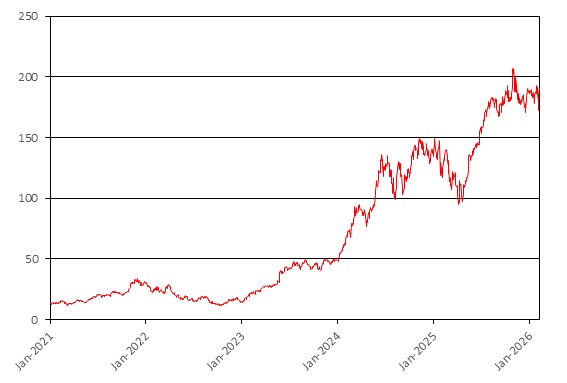 We obtained the information regarding the historical performance of the reference asset in the graph below from Bloomberg, without independent review or verification. The graph below illustrates the performance of the reference asset from January 1, 2021 through February 9, 2026. The closing price of the reference asset on February 9, 2026 was $190.04.