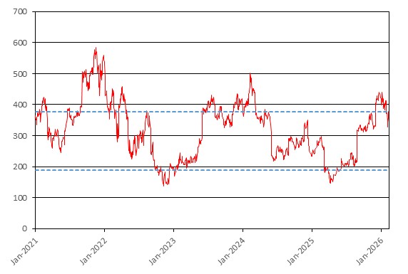 The closing price of MongoDB on February 10, 2026 was $377.26 (the “hypothetical initial share price”). The graph below shows the closing prices of MongoDB for each day from January 1, 2021 to February 10, 2026. The dotted lines represent a hypothetical downside threshold price of $188.63 and a hypothetical call threshold price of $377.26, which are equal to 50.00% and 100.00%, respectively, of the hypothetical initial share price. The actual downside threshold price and call threshold price will be set on the pricing date. We obtained the information in the graph below from Bloomberg Professional® service (“Bloomberg”), without independent verification. The closing prices may be adjusted by Bloomberg for corporate actions such as stock splits, public offerings, mergers and acquisitions, spin-offs, delistings and bankruptcy. BNS has not undertaken an independent review or due diligence of any publicly available information obtained from Bloomberg. The historical performance of MongoDB should not be taken as an indication of its future performance, and no assurance can be given as to the price of MongoDB at any time, including the determination dates.