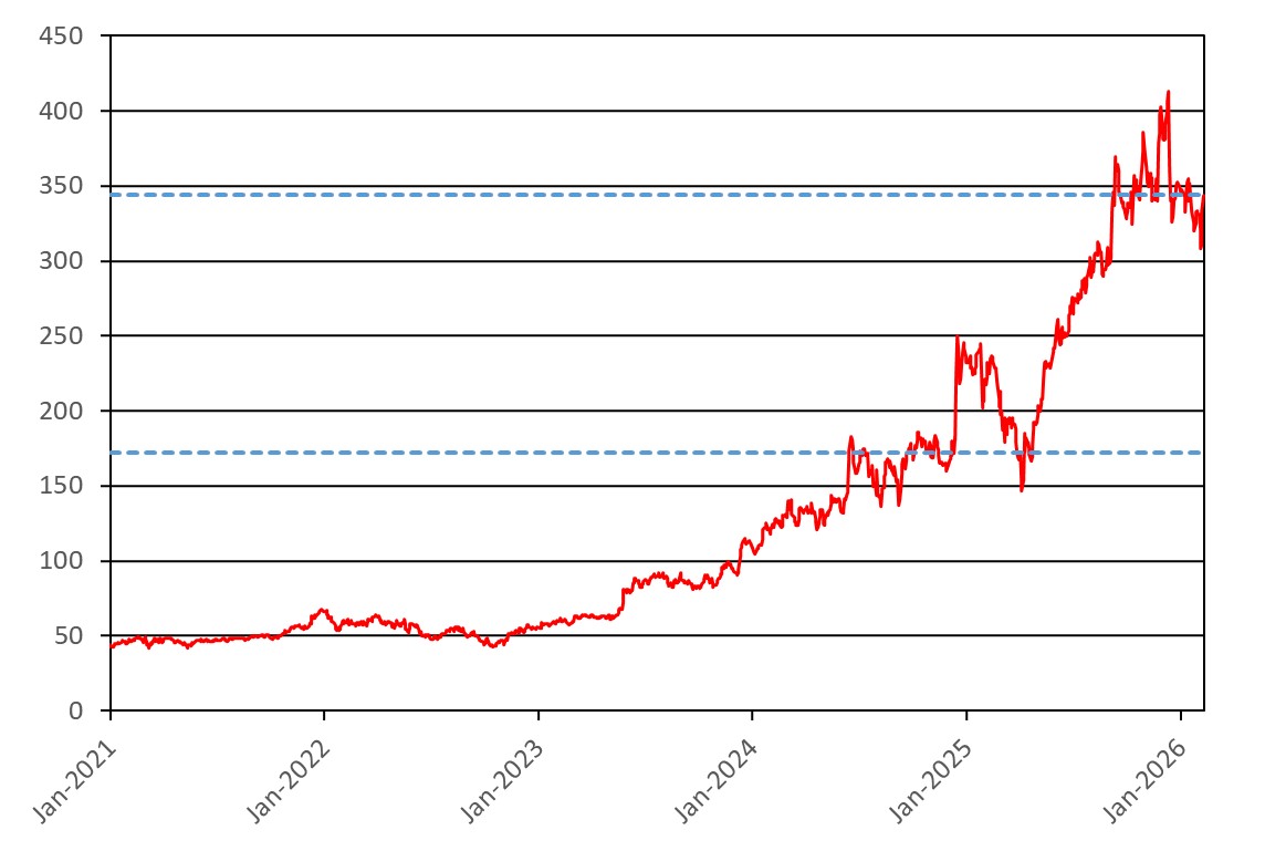 The closing price of Broadcom on February 10, 2026 was $340.44 (the “hypothetical initial share price”). The graph below shows the closing prices of Broadcom for each day from January 1, 2021 to February 10, 2026. The dotted lines represent a hypothetical downside threshold price of $170.22 and a hypothetical call threshold price of $340.44, which are equal to 50.00% and 100.00%, respectively, of the hypothetical initial share price. The actual downside threshold price and call threshold price will be set on the pricing date. We obtained the information in the graph below from Bloomberg Professional® service (“Bloomberg”), without independent verification. The closing prices may be adjusted by Bloomberg for corporate actions such as stock splits, public offerings, mergers and acquisitions, spin-offs, delistings and bankruptcy. BNS has not undertaken an independent review or due diligence of any publicly available information obtained from Bloomberg. The historical performance of Broadcom should not be taken as an indication of its future performance, and no assurance can be given as to the price of Broadcom at any time, including the determination dates.