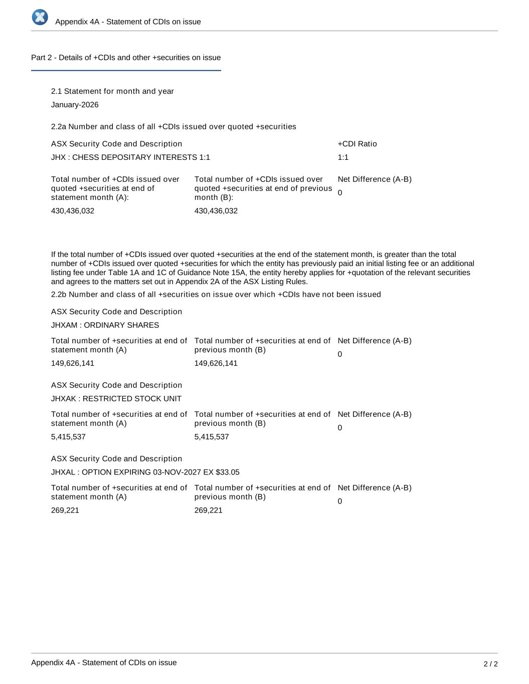 Appendix 4A - Statement of CDIs on issue Appendix 4A - Statement of CDIs on issue 2 / 2 Part 2 - Details of +CDIs and other +securities on issue 2.1 Statement for month and year January-2026 2.2a Number and class of all +CDIs issued over quoted +securities ASX Security Code and Description JHX : CHESS DEPOSITARY INTERESTS 1:1 +CDI Ratio 1:1 Total number of +CDIs issued over quoted +securities at end of statement month (A): 430,436,032 Total number of +CDIs issued over quoted +securities at end of previous month (B): 430,436,032 Net Difference (A-B) 0 If the total number of +CDIs issued over quoted +securities at the end of the statement month, is greater than the total number of +CDIs issued over quoted +securities for which the entity has previously paid an initial listing fee or an additional listing fee under Table 1A and 1C of Guidance Note 15A, the entity hereby applies for +quotation of the relevant securities and agrees to the matters set out in Appendix 2A of the ASX Listing Rules. 2.2b Number and class of all +securities on issue over which +CDIs have not been issued ASX Security Code and Description JHXAM : ORDINARY SHARES Total number of +securities at end of statement month (A) 149,626,141 Total number of +securities at end of previous month (B) 149,626,141 Net Difference (A-B) 0 ASX Security Code and Description JHXAK : RESTRICTED STOCK UNIT Total number of +securities at end of statement month (A) 5,415,537 Total number of +securities at end of previous month (B) 5,415,537 Net Difference (A-B) 0 ASX Security Code and Description JHXAL : OPTION EXPIRING 03-NOV-2027 EX $33.05 Total number of +securities at end of statement month (A) 269,221 Total number of +securities at end of previous month (B) 269,221 Net Difference (A-B) 0