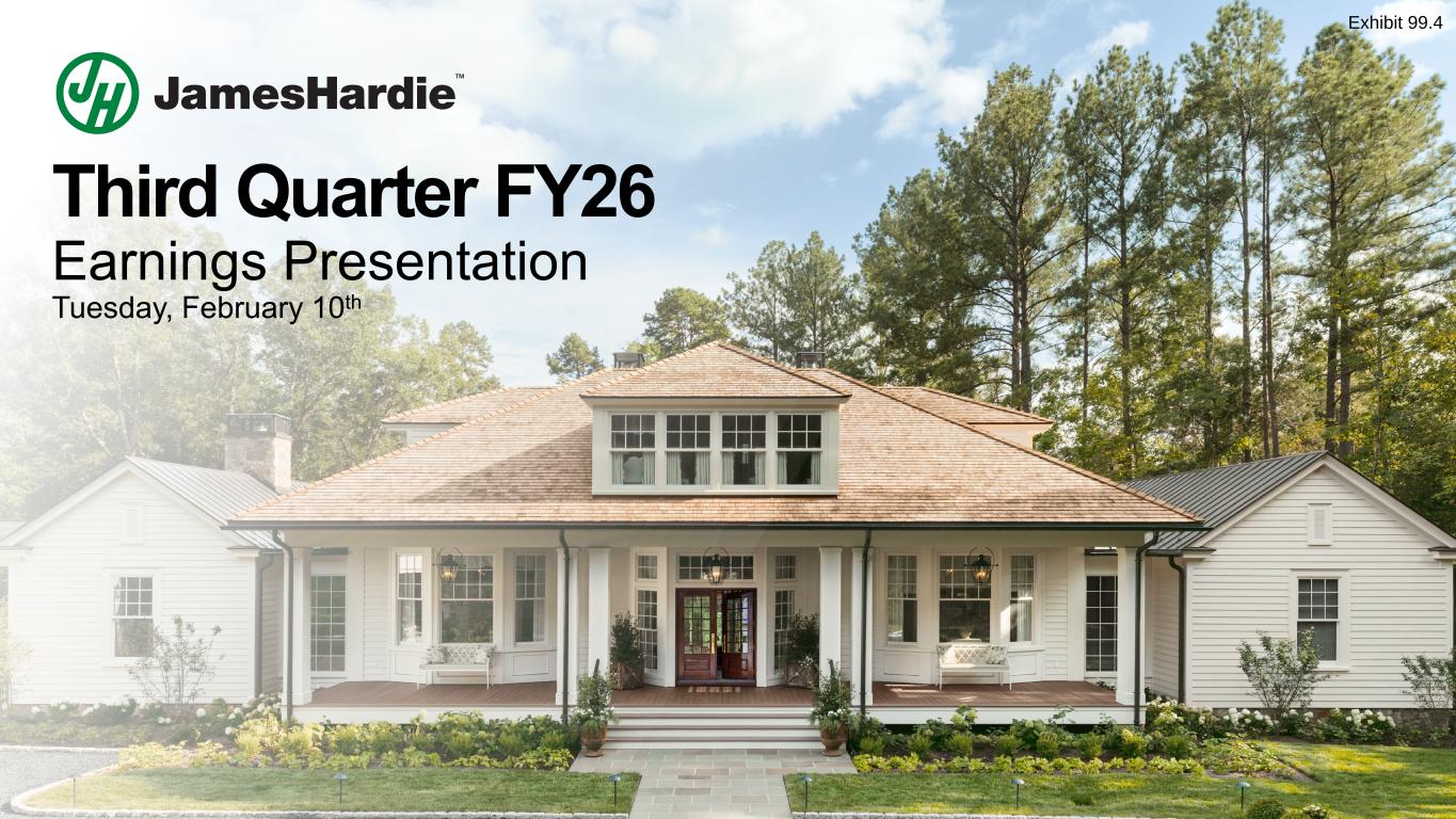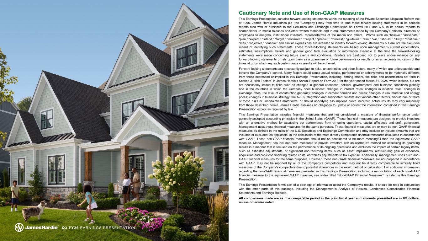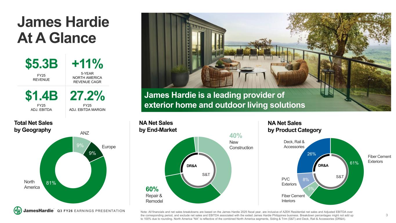 2 Q3 FY26 EARNINGS PRESENTATION Cautionary Note and Use of Non-GAAP Measures This Earnings Presentation contains forward looking statements within the meaning of the Private Securities Litigation Reform Act of 1995. James Hardie Industries plc (the “Company”) may from time to time make forward-looking statements in its periodic reports filed with or furnished to the Securities and Exchange Commission on Forms 20-F and 6-K, in its annual reports to shareholders, in media releases and other written materials and in oral statements made by the Company’s officers, directors or employees to analysts, institutional investors, representatives of the media and others. Words such as “believe,” “anticipate,” “plan,” “expect,” “intend,” “target,” “estimate,” “project,” “predict,” “forecast,” “guideline,” “aim,” “will,” “should,” “likely,” “continue,” “may,” “objective,” “outlook” and similar expressions are intended to identify forward-looking statements but are not the exclusive means of identifying such statements. These forward-looking statements are based upon management's current expectations, estimates, assumptions, beliefs and general good faith evaluation of information available at the time the forward-looking statements were made concerning future events and conditions. Readers are cautioned not to place undue reliance on any forward-looking statements or rely upon them as a guarantee of future performance or results or as an accurate indication of the times at or by which any such performance or results will be achieved. Forward-looking statements are necessarily subject to risks, uncertainties and other factors, many of which are unforeseeable and beyond the Company’s control. Many factors could cause actual results, performance or achievements to be materially different from those expressed or implied in this Earnings Presentation, including, among others, the risks and uncertainties set forth in Section 3 “Risk Factors” in James Hardie’s Annual Report on Form 20-F for the year ended March 31, 2025, which include, but are not necessarily limited to risks such as changes in general economic, political, governmental and business conditions globally and in the countries in which the Company does business; changes in interest rates; changes in inflation rates; changes in exchange rates; the level of construction generally; changes in cement demand and prices; changes in raw material and energy prices; changes in business strategy; the AZEK integration and anticipated benefits and various other factors. Should one or more of these risks or uncertainties materialize, or should underlying assumptions prove incorrect, actual results may vary materially from those described herein. James Hardie assumes no obligation to update or correct the information contained in this Earnings Presentation except as required by law. This Earnings Presentation includes financial measures that are not considered a measure of financial performance under generally accepted accounting principles in the United States (GAAP). These financial measures are designed to provide investors with an alternative method for assessing our performance from on-going operations, capital efficiency and profit generation. Management uses these financial measures for the same purposes. These financial measures are or may be non-GAAP financial measures as defined in the rules of the U.S. Securities and Exchange Commission and may exclude or include amounts that are included or excluded, as applicable, in the calculation of the most directly comparable financial measures calculated in accordance with GAAP. These non-GAAP financial measures should not be considered to be more meaningful than the equivalent GAAP measure. Management has included such measures to provide investors with an alternative method for assessing its operating results in a manner that is focused on the performance of its ongoing operations and excludes the impact of certain legacy items, such as asbestos adjustments, or significant non-recurring items, such as asset impairments, restructuring gain or expenses, acquisition and pre-close financing related costs, as well as adjustments to tax expense. Additionally, management uses such non- GAAP financial measures for the same purposes. However, these non-GAAP financial measures are not prepared in accordance with GAAP, may not be reported by all of the Company’s competitors and may not be directly comparable to similarly titled measures of the Company’s competitors due to potential differences in the exact method of calculation. For additional information regarding the non-GAAP financial measures presented in this Earnings Presentation, including a reconciliation of each non-GAAP financial measure to the equivalent GAAP measure, see slides titled “Non-GAAP Financial Measures” included in this Earnings Presentation. This Earnings Presentation forms part of a package of information about the Company’s results. It should be read in conjunction with the other parts of this package, including the Management’s Analysis of Results, Condensed Consolidated Financial Statements and Earnings Release. All comparisons made are vs. the comparable period in the prior fiscal year and amounts presented are in US dollars, unless otherwise noted.