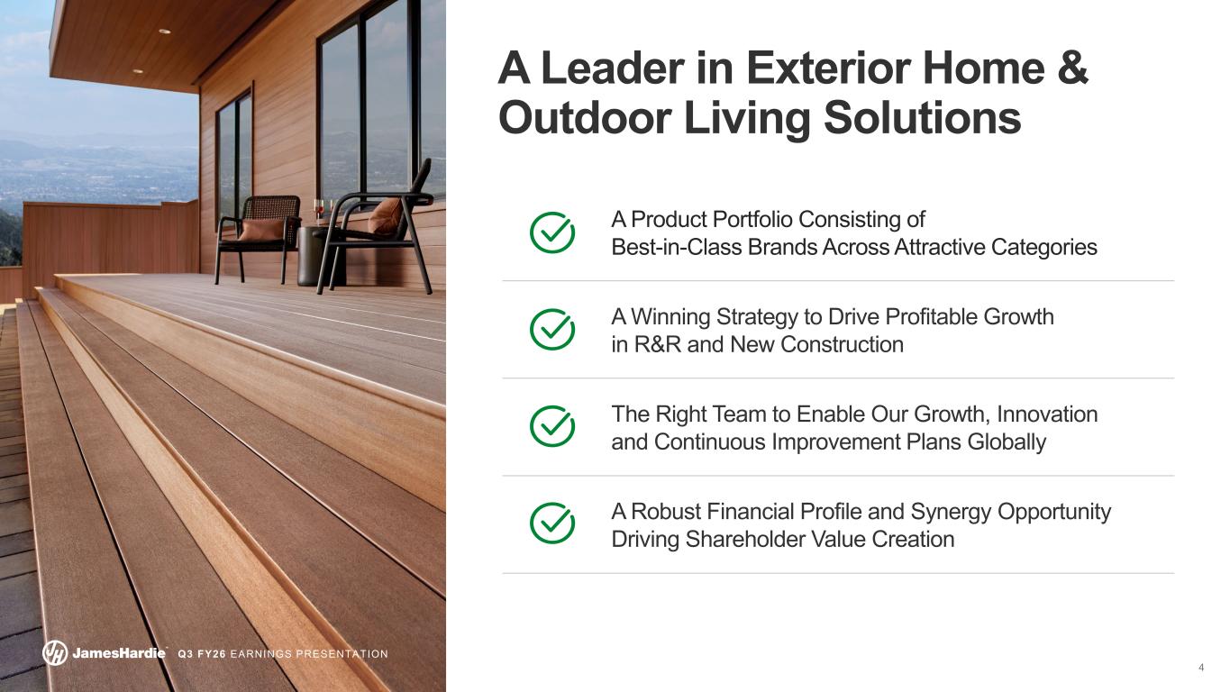 3 Q3 FY26 EARNINGS PRESENTATION 61% 5% 8% 26% James Hardie At A Glance James Hardie is a leading provider of exterior home and outdoor living solutions $5.3B FY25 REVENUE +11% 5-YEAR NORTH AMERICA REVENUE CAGR $1.4B FY25 ADJ. EBITDA 27.2% FY25 ADJ. EBITDA MARGIN Note: All financials and net sales breakdowns are based on the James Hardie 2025 fiscal year, are inclusive of AZEK Residential net sales and Adjusted EBITDA over the corresponding period, and exclude net sales and EBITDA associated with the exited James Hardie Philippines business. Breakdown percentages might not add up to 100% due to rounding. North America “NA” is reflective of the combined North America segments, Siding & Trim (S&T) and Deck, Rail & Accessories (DR&A). 81% 9% 9% Total Net Sales by Geography North America ANZ Europe NA Net Sales by Product Category Fiber Cement Exteriors NA Net Sales by End-Market 40% New Construction 60% Repair & Remodel PVC Exteriors Fiber Cement Interiors Deck, Rail & Accessories DR&A S&T DR&A S&T