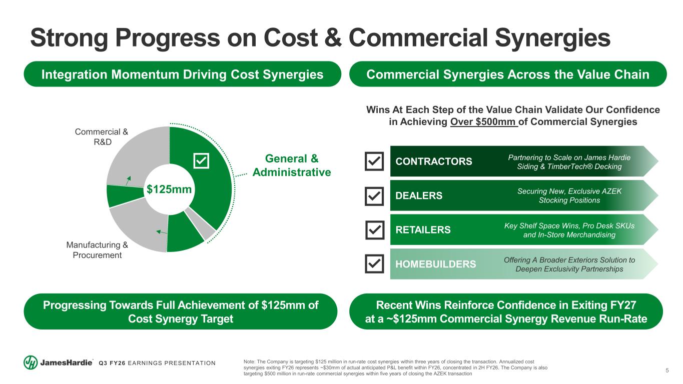 4 Q3 FY26 EARNINGS PRESENTATION A Leader in Exterior Home & Outdoor Living Solutions A Product Portfolio Consisting of Best-in-Class Brands Across Attractive Categories A Winning Strategy to Drive Profitable Growth in R&R and New Construction The Right Team to Enable Our Growth, Innovation and Continuous Improvement Plans Globally A Robust Financial Profile and Synergy Opportunity Driving Shareholder Value Creation