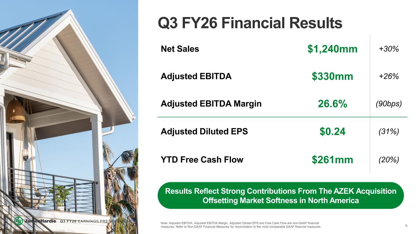 5 Q3 FY26 EARNINGS PRESENTATION Strong Progress on Cost & Commercial Synergies Progressing Towards Full Achievement of $125mm of Cost Synergy Target Note: The Company is targeting $125 million in run-rate cost synergies within three years of closing the transaction. Annualized cost synergies exiting FY26 represents ~$30mm of actual anticipated P&L benefit within FY26, concentrated in 2H FY26. The Company is also targeting $500 million in run-rate commercial synergies within five years of closing the AZEK transaction Manufacturing & Procurement Commercial & R&D General & Administrative $125mm Integration Momentum Driving Cost Synergies CONTRACTORS DEALERS RETAILERS HOMEBUILDERS Partnering to Scale on James Hardie Siding & TimberTech® Decking Securing New, Exclusive AZEK Stocking Positions Key Shelf Space Wins, Pro Desk SKUs and In-Store Merchandising Offering A Broader Exteriors Solution to Deepen Exclusivity Partnerships Wins At Each Step of the Value Chain Validate Our Confidence in Achieving Over $500mm of Commercial Synergies Commercial Synergies Across the Value Chain Recent Wins Reinforce Confidence in Exiting FY27 at a ~$125mm Commercial Synergy Revenue Run-Rate