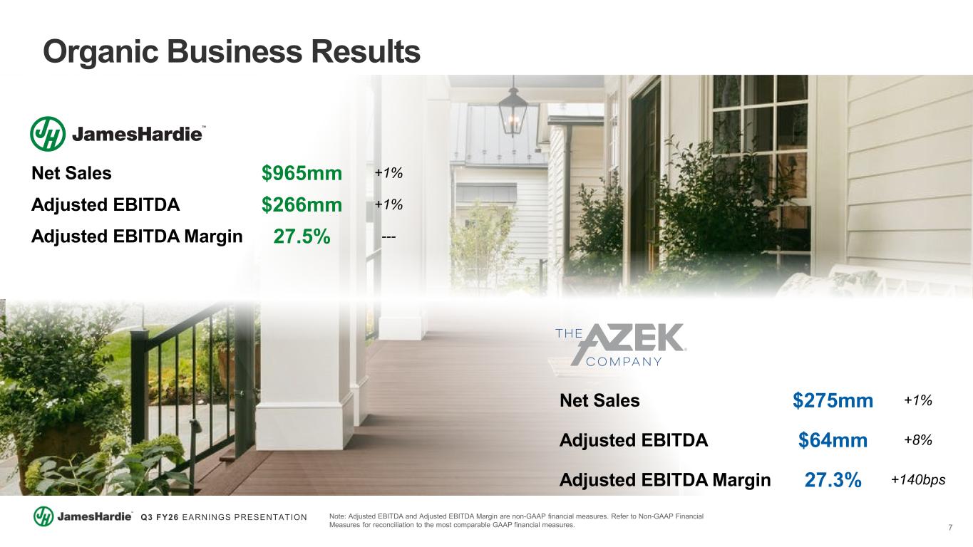 6 Q3 FY26 EARNINGS PRESENTATION Q3 FY26 Financial Results Results Reflect Strong Contributions From The AZEK Acquisition Offsetting Market Softness in North America Net Sales $1,240mm +30% Adjusted EBITDA $330mm +26% Adjusted EBITDA Margin 26.6% (90bps) Adjusted Diluted EPS $0.24 (31%) YTD Free Cash Flow $261mm (20%) Note: Adjusted EBITDA, Adjusted EBITDA Margin, Adjusted Diluted EPS and Free Cash Flow are non-GAAP financial measures. Refer to Non-GAAP Financial Measures for reconciliation to the most comparable GAAP financial measures.