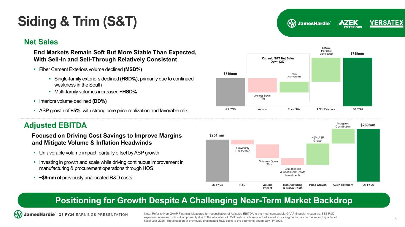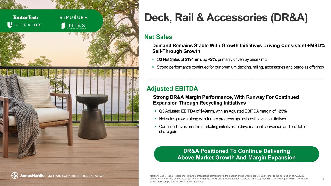 8 Q3 FY26 EARNINGS PRESENTATION $251mm $269mm Cost Inflation & Continued Growth Investments +5% ASP Growth Inorganic Contribution Q3 FY25 R&D Volume Impact Manufacturing & SG&A Costs Price Growth AZEK Exteriors Q3 FY26 Volumes Down (7%) Previously Unallocated Net Sales End Markets Remain Soft But More Stable Than Expected, With Sell-In and Sell-Through Relatively Consistent Fiber Cement Exteriors volume declined (MSD%) Single-family exteriors declined (HSD%), primarily due to continued weakness in the South Multi-family volumes increased +HSD% Interiors volume declined (DD%) ASP growth of +5%, with strong core price realization and favorable mix $719mm $788mm +5% ASP Growth Q3 FY25 Volume Price / Mix AZEK Exteriors Q3 FY26 Volumes Down (7%) Organic S&T Net Sales Down (2%) $81mm Inorganic Contribution Siding & Trim (S&T) Positioning for Growth Despite A Challenging Near-Term Market Backdrop Adjusted EBITDA Focused on Driving Cost Savings to Improve Margins and Mitigate Volume & Inflation Headwinds Unfavorable volume impact, partially offset by ASP growth Investing in growth and scale while driving continuous improvement in manufacturing & procurement operations through HOS ~$9mm of previously unallocated R&D costs Note: Refer to Non-GAAP Financial Measures for reconciliation of Adjusted EBITDA to the most comparable GAAP financial measures. S&T R&D expenses increased ~$9 million primarily due to the allocation of R&D costs which were not allocated to our segments prior to the second quarter of fiscal year 2026. The allocation of previously unallocated R&D costs to the segments began July, 1st 2025.