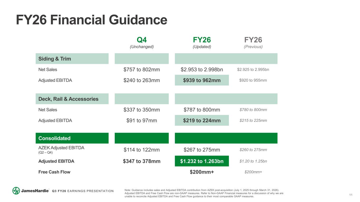 10 Q3 FY26 EARNINGS PRESENTATION $118mm $127mm +LSD% Volume Increase +MSD% ASP Growth Q3 FY25 Volume Price / Mix FX / Other Q3 FY26 $116mm +LSD% Sales Increase in Local Currency $131mm +MSD% Volume Increase Solid Underlying Price Realization Offset by Mix FX Tailwind Q3 FY25 Volume Price / Mix FX / Other Q3 FY26 $12mm $17mm Volume Growth Driving Improved Cost Absorption Margin Expansion Initiatives Q3 FY25 Sales Growth Operating Costs Q3 FY26 $40mm $41mm Net Sales Increased +7% ~$1mm R&D Allocation Headwind Q3 FY25 Sales Growth Operating Costs Q3 FY26 Australia & New Zealand (ANZ) Europe Net Sales ANZ Net Sales Increased +7% While Residential Construction Backdrop Remains Muted Adjusted EBITDA Strong Profitability Continues with Adj EBITDA Margin of ~33% Despite R&D Allocation Headwind Net Sales Sales Growth Driven by Strong Performance in Fiber Gypsum Products EBITDA Volume Growth & Margin Initiatives Driving Profit Improvement Note: Refer to Non-GAAP Financial Measures for reconciliation of Adjusted EBITDA and Adjusted EBITDA Margin to the most comparable GAAP financial measures. R&D expenses increased primarily due to the allocation of R&D costs which were not allocated to our segments prior to the second quarter of fiscal year 2026. The allocation of previously unallocated R&D costs to the segments began July, 1st 2025.