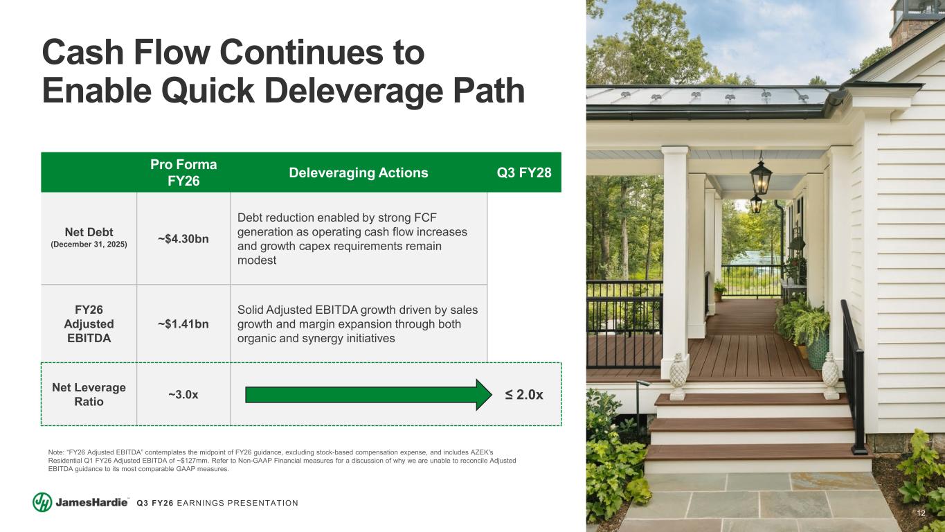 11 Q3 FY26 EARNINGS PRESENTATION FY26 Financial Guidance Note: Guidance includes sales and Adjusted EBITDA contribution from AZEK post-acquisition (July 1, 2025 through March 31, 2026). Adjusted EBITDA and Free Cash Flow are non-GAAP measures. Refer to Non-GAAP Financial measures for a discussion of why we are unable to reconcile Adjusted EBITDA and Free Cash Flow guidance to their most comparable GAAP measures. Q4 (Unchanged) FY26 (Updated) FY26 (Previous) Deck, Rail & Accessories Net Sales $337 to 350mm $787 to 800mm $780 to 800mm Adjusted EBITDA $91 to 97mm $219 to 224mm $215 to 225mm Consolidated AZEK Adjusted EBITDA (Q2 – Q4) $114 to 122mm $267 to 275mm $260 to 275mm Adjusted EBITDA $347 to 378mm $1.232 to 1.263bn $1.20 to 1.25bn Free Cash Flow $200mm+ $200mm+ Siding & Trim Net Sales $757 to 802mm $2.953 to 2.998bn $2.925 to 2.995bn Adjusted EBITDA $240 to 263mm $939 to 962mm $920 to 955mm
