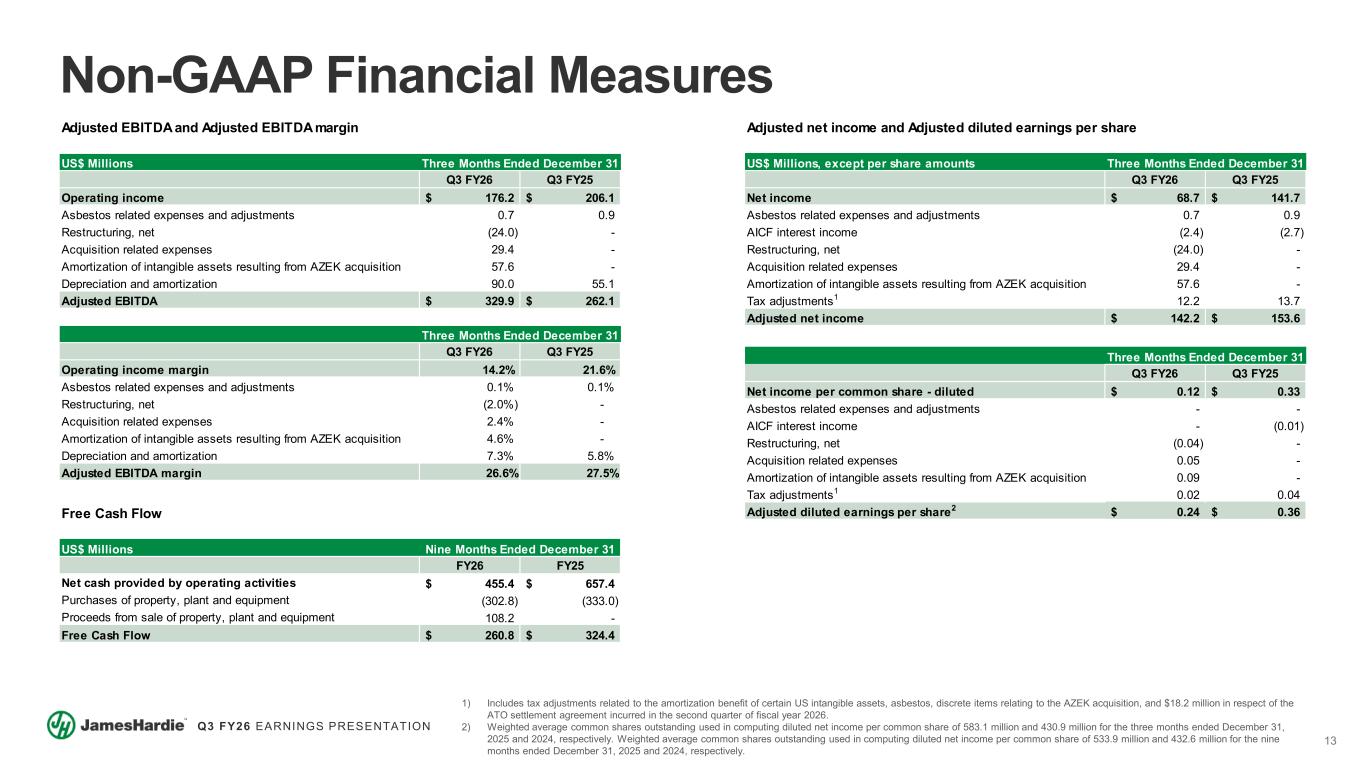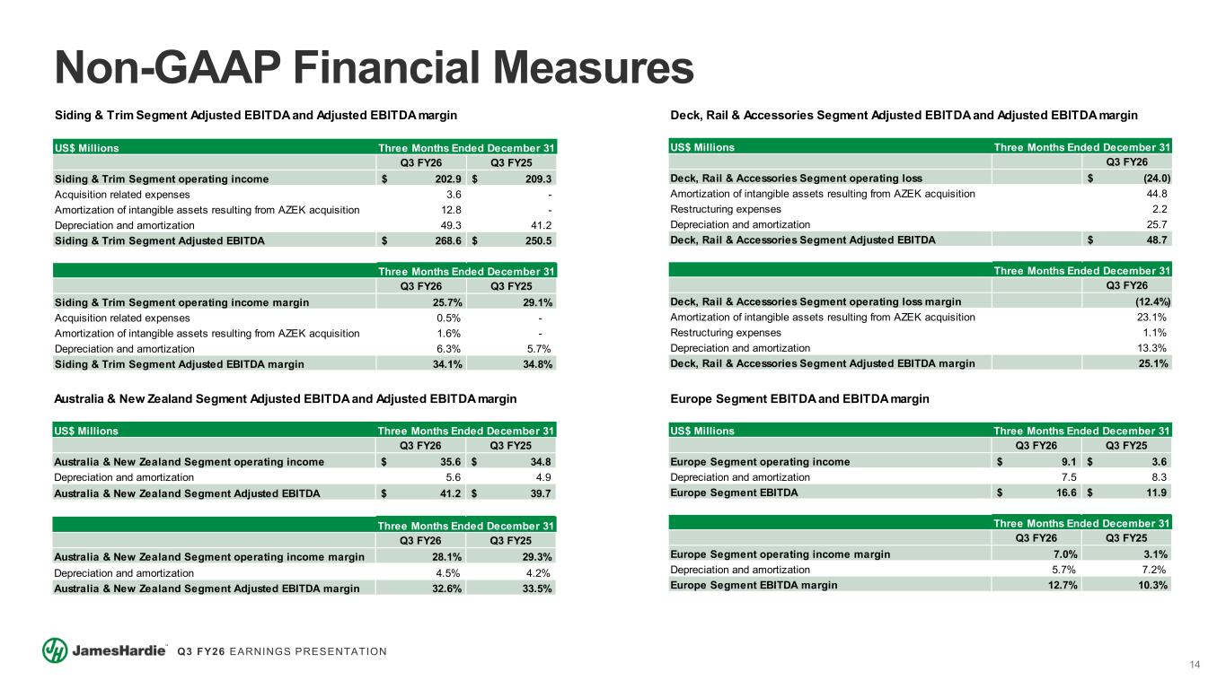 13 Q3 FY26 EARNINGS PRESENTATION Adjusted EBITDA and Adjusted EBITDA margin US$ Millions Q3 FY26 Q3 FY25 Operating income 176.2$ 206.1$ Asbestos related expenses and adjustments 0.7 0.9 Restructuring, net (24.0) - Acquisition related expenses 29.4 - Amortization of intangible assets resulting from AZEK acquisition 57.6 - Depreciation and amortization 90.0 55.1 Adjusted EBITDA 329.9$ 262.1$ Q3 FY26 Q3 FY25 Operating income margin 14.2% 21.6% Asbestos related expenses and adjustments 0.1% 0.1% Restructuring, net (2.0%) - Acquisition related expenses 2.4% - Amortization of intangible assets resulting from AZEK acquisition 4.6% - Depreciation and amortization 7.3% 5.8% Adjusted EBITDA margin 26.6% 27.5% Three Months Ended December 31 Three Months Ended December 31 Non-GAAP Financial Measures Adjusted net income and Adjusted diluted earnings per share US$ Millions, except per share amounts Three Months Ended December 31 Q3 FY26 Q3 FY25 Net income 68.7$ 141.7$ Asbestos related expenses and adjustments 0.7 0.9 AICF interest income (2.4) (2.7) Restructuring, net (24.0) - Acquisition related expenses 29.4 - Amortization of intangible assets resulting from AZEK acquisition 57.6 - Tax adjustments1 12.2 13.7 Adjusted net income 142.2$ 153.6$ Three Months Ended December 31 Q3 FY26 Q3 FY25 Net income per common share - diluted 0.12$ 0.33$ Asbestos related expenses and adjustments - - AICF interest income - (0.01) Restructuring, net (0.04) - Acquisition related expenses 0.05 - Amortization of intangible assets resulting from AZEK acquisition 0.09 - Tax adjustments1 0.02 0.04 Adjusted diluted earnings per share2 0.24$ 0.36$ 1) Includes tax adjustments related to the amortization benefit of certain US intangible assets, asbestos, discrete items relating to the AZEK acquisition, and $18.2 million in respect of the ATO settlement agreement incurred in the second quarter of fiscal year 2026. 2) Weighted average common shares outstanding used in computing diluted net income per common share of 583.1 million and 430.9 million for the three months ended December 31, 2025 and 2024, respectively. Weighted average common shares outstanding used in computing diluted net income per common share of 533.9 million and 432.6 million for the nine months ended December 31, 2025 and 2024, respectively. Free Cash Flow US$ Millions FY26 FY25 Net cash provided by operating activities 455.4$ 657.4$ Purchases of property, plant and equipment (302.8) (333.0) Proceeds from sale of property, plant and equipment 108.2 - Free Cash Flow 260.8$ 324.4$ Nine Months Ended December 31