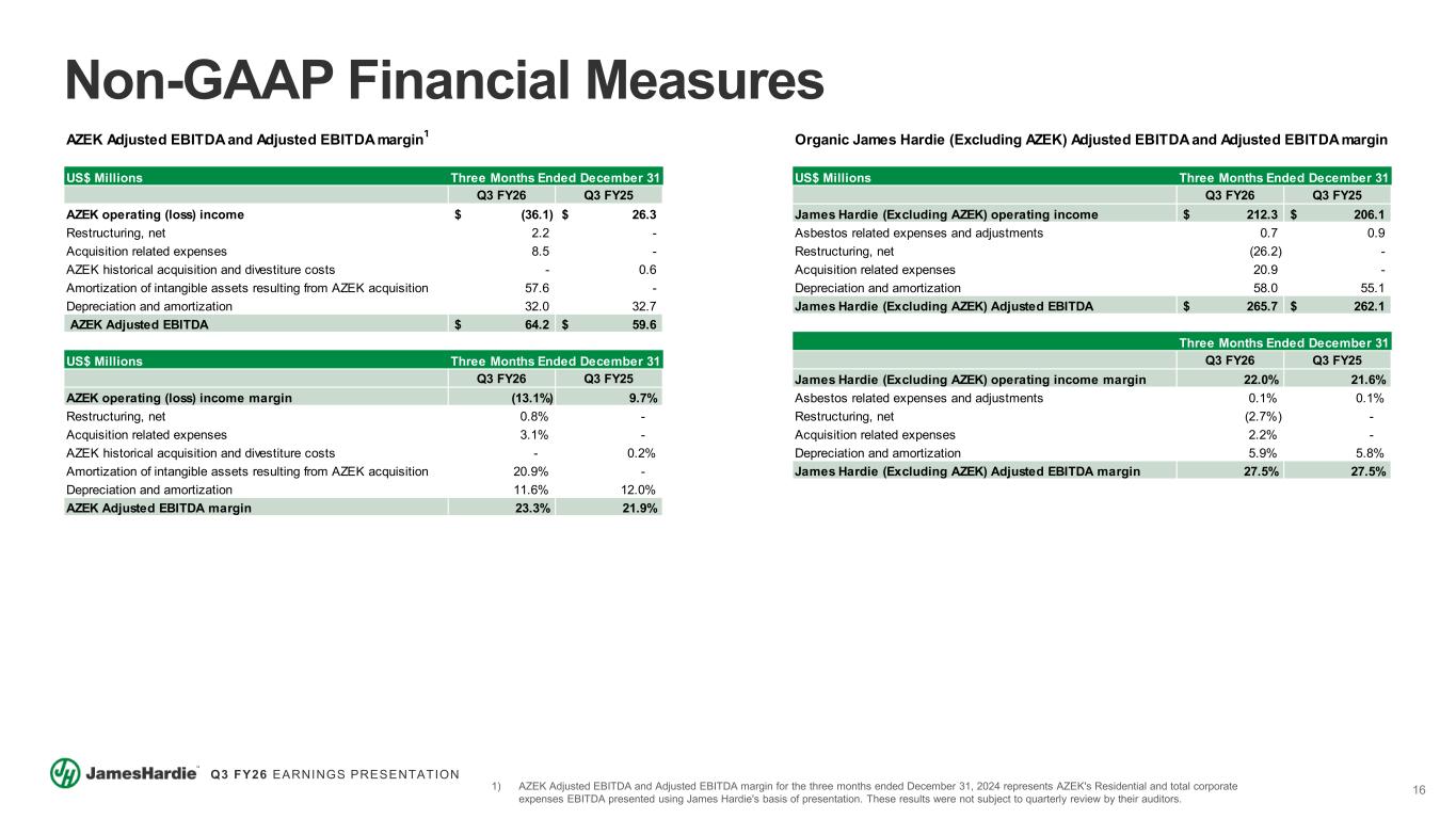 15 Q3 FY26 EARNINGS PRESENTATION Net Leverage Ratio US$ Millions December 31 FY26 Numerator: Total principal amount of debt 4,648.1$ Less: Cash and cash equivalents (344.2) Add: Finance operating leases 109.0 Total 4,412.9$ Denominator: (Trailing 12 months) Operating income 400.9$ Asbestos related expenses and adjustments 140.2 Restructuring, net (31.0) Acquisition related expenses 205.6 Inventory fair value adjustment 47.9 Amortization of intangible assets resulting from AZEK acquisition 106.3 Depreciation and amortization 283.6 Stock compensation - equity awards 24.5 Acquired Adjusted EBITDA for preceding periods 249.2 Cost synergies 111.9 Total 1,539.1$ Net Leverage ratio 2.87x US$ Millions Three Months Ended December 31 Q3 FY26 Q3 FY25 Income before income taxes 110.6$ 202.3$ Asbestos related expenses and adjustments 0.7 0.9 AICF interest income (2.4) (2.7) Restructuring, net (24.0) - Acquisition related expenses 29.4 - Amortization of intangible assets resulting from AZEK acquisition 57.6 - Adjusted income before income taxes 171.9$ 200.5$ Income tax expense 41.9$ 60.6$ Tax adjustments1 (12.2) (13.7) Adjusted income tax expense 29.7$ 46.9$ Effective tax rate 37.9% 30.0% Adjusted effective tax rate 17.3% 23.4% Adjusted income before income taxes, Adjusted income tax expense and Adjusted effective tax rate Net Debt US$ Millions December 31 FY26 Total principal amount of debt 4,648.1$ Cash and cash equivalents (344.2) Net debt 4,303.9$ Non-GAAP Financial Measures US$ Millions Three Months Ended December 31 Q3 FY26 Q3 FY25 Interest, net 65.6$ 3.8$ AICF interest income 2.4 2.7 Adjusted interest, net 68.0$ 6.5$ Adjusted interest, net 1) Includes tax adjustments related to the amortization benefit of certain US intangible assets, asbestos and discrete items relating to the AZEK acquisition. US$ Millions Three Months Ended December 31 Q3 FY26 Q3 FY25 General Corporate and Unallocated R&D costs (47.4)$ (41.6)$ Restructuring gain (26.2) - Acquisition related expenses 25.8 - Asbestos related expenses and adjustments 0.7 0.9 Adjusted General Corporate and Unallocated R&D costs (47.1)$ (40.7)$ Depreciation and amortization 1.9 0.7 Adjusted General Corporate and Unallocated R&D EBITDA (45.2)$ (40.0)$ Adjusted General Corporate and Unallocated R&D EBITDA
