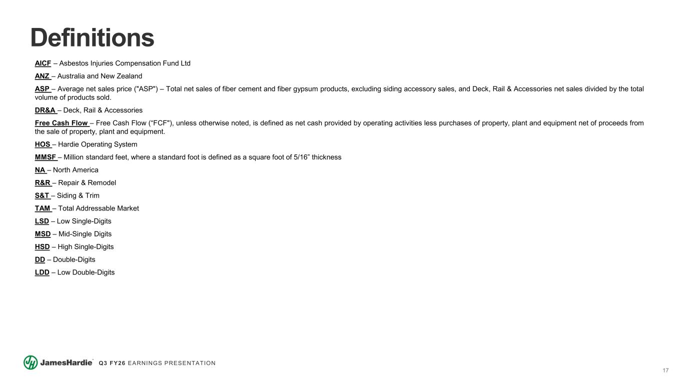 16 Q3 FY26 EARNINGS PRESENTATION Non-GAAP Financial Measures US$ Millions Q3 FY26 Q3 FY25 James Hardie (Excluding AZEK) operating income 212.3$ 206.1$ Asbestos related expenses and adjustments 0.7 0.9 Restructuring, net (26.2) - Acquisition related expenses 20.9 - Depreciation and amortization 58.0 55.1 James Hardie (Excluding AZEK) Adjusted EBITDA 265.7$ 262.1$ Q3 FY26 Q3 FY25 James Hardie (Excluding AZEK) operating income margin 22.0% 21.6% Asbestos related expenses and adjustments 0.1% 0.1% Restructuring, net (2.7%) - Acquisition related expenses 2.2% - Depreciation and amortization 5.9% 5.8% James Hardie (Excluding AZEK) Adjusted EBITDA margin 27.5% 27.5% Three Months Ended December 31 Three Months Ended December 31 Organic James Hardie (Excluding AZEK) Adjusted EBITDA and Adjusted EBITDA margin 1) AZEK Adjusted EBITDA and Adjusted EBITDA margin for the three months ended December 31, 2024 represents AZEK's Residential and total corporate expenses EBITDA presented using James Hardie's basis of presentation. These results were not subject to quarterly review by their auditors. US$ Millions Q3 FY26 Q3 FY25 AZEK operating (loss) income (36.1)$ 26.3$ Restructuring, net 2.2 - Acquisition related expenses 8.5 - AZEK historical acquisition and divestiture costs - 0.6 Amortization of intangible assets resulting from AZEK acquisition 57.6 - Depreciation and amortization 32.0 32.7 AZEK Adjusted EBITDA 64.2$ 59.6$ US$ Millions Q3 FY26 Q3 FY25 AZEK operating (loss) income margin (13.1%) 9.7% Restructuring, net 0.8% - Acquisition related expenses 3.1% - AZEK historical acquisition and divestiture costs - 0.2% Amortization of intangible assets resulting from AZEK acquisition 20.9% - Depreciation and amortization 11.6% 12.0% AZEK Adjusted EBITDA margin 23.3% 21.9% Three Months Ended December 31 Three Months Ended December 31 AZEK Adjusted EBITDA and Adjusted EBITDA margin1