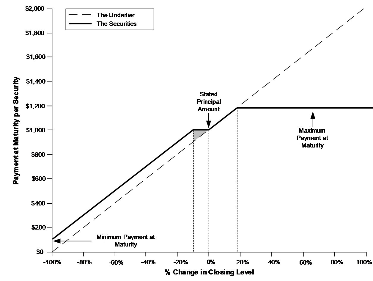 The payoff diagram and table below illustrate the payment at maturity for a range of hypothetical performances of the underlier over the term of the securities.
