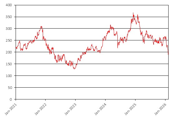 We obtained the information regarding the historical performance of the reference asset in the graph below from Bloomberg, without independent review or verification. The graph below illustrates the performance of the reference asset from January 1, 2021 through February 9, 2026. The closing price of the reference asset on February 9, 2026 was $194.03.