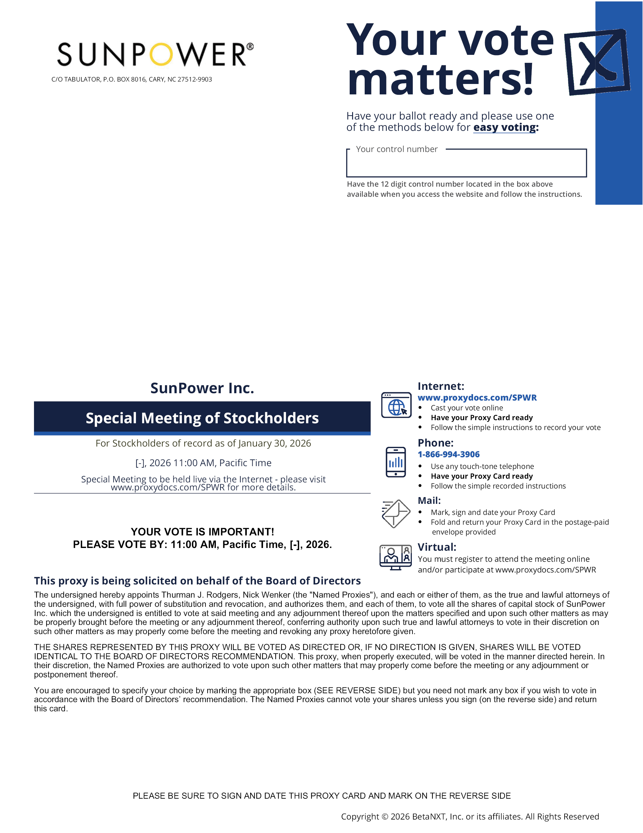 Your vote matters C/O TABULATOR, P.O. BOX 8016, CARY, NC 27512-9903 Have your ballot ready and please use one of the methods below for easy voting: Your control number Have the 12 digit control number located in the box above available when you access the website and follow the instructions. SunPower Inc. Special Meeting of Stockholders For Stockholders of record as of January 30, 2026 [-], 2026 11:00 AM, Pacific Time Special Meeting to be held live via the Internet - please visit www.proxydocs.com/SPWR for more details YOUR VOTE IS IMPORTANT! PLEASE VOTE BY: 11:00 AM, Pacific Time, [-], 2026. Internet: www.proxydocs.com/SPWR Cast your vote online Have your Proxy Card ready Follow the simple instructions to record your vote Phone: 1-866-994-3906 Use any touch-tone telephone Have your Proxy Card ready Follow the simple recorded instructions Mail: Mark, sign and date your Proxy Card Fold and return your Proxy Card in the postage-paid envelope provided Virtual: You must register to attend the meeting online and/or participate at www.proxydocs.com/SPWR This proxy is being solicited on behalf of the Board of Directors The undersigned hereby appoints Thurman J. Rodgers, Nick Wenker (the “Named Proxies”), and each or either of them, as the true and lawful attorneys of the undersigned, with full power of substitution and revocation, and authorizes them, and each of them, to vote all the shares of capital stock of SunPower Inc. which the undersigned is entitled to vote at said meeting and any adjournment thereof upon the matters specified and upon such other matters as may be properly brought before the meeting or any adjournment thereof, conferring authority upon such true and lawful attorneys to vote in their discretion on such other matters as may properly come before the meeting and revoking any proxy heretofore given. THE SHARES REPRESENTED BY THIS PROXY WILL BE VOTED AS DIRECTED OR, IF NO DIRECTION IS GIVEN, SHARES WILL BE VOTED IDENTICAL TO THE BOARD OF DIRECTORS RECOMMENDATION. This proxy, when properly executed, will be voted in the manner directed herein. In their discretion, the Named Proxies are authorized to vote upon such other matters that may properly come before the meeting or any adjournment or postponement thereof. You are encouraged to specify your choice by marking the appropriate box (SEE REVERSE SIDE) but you need not mark any box if you wish to vote in accordance with the Board of Directors’ recommendation. The Named Proxies cannot vote your shares unless you sign (on the reverse side) and return this card. PLEASE BE SURE TO SIGN AND DATE THIS PROXY CARD AND MARK ON THE REVERSE SIDE Copyright © 2026 BetaNXT, Inc. or its affiliates. All Rights Reserved